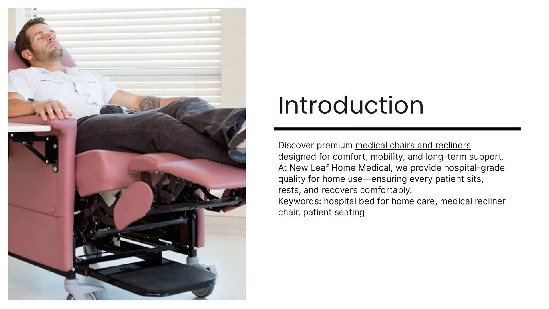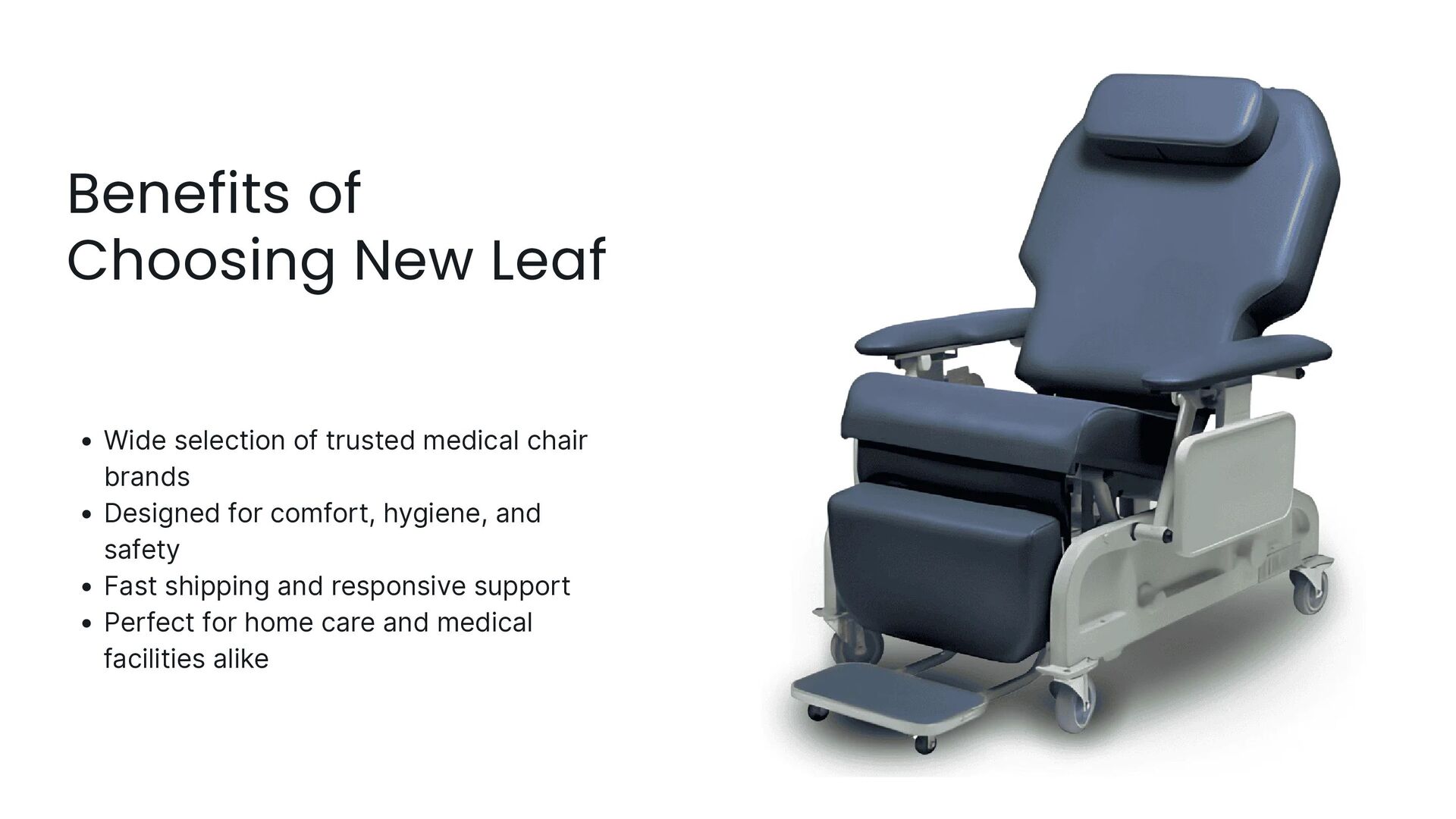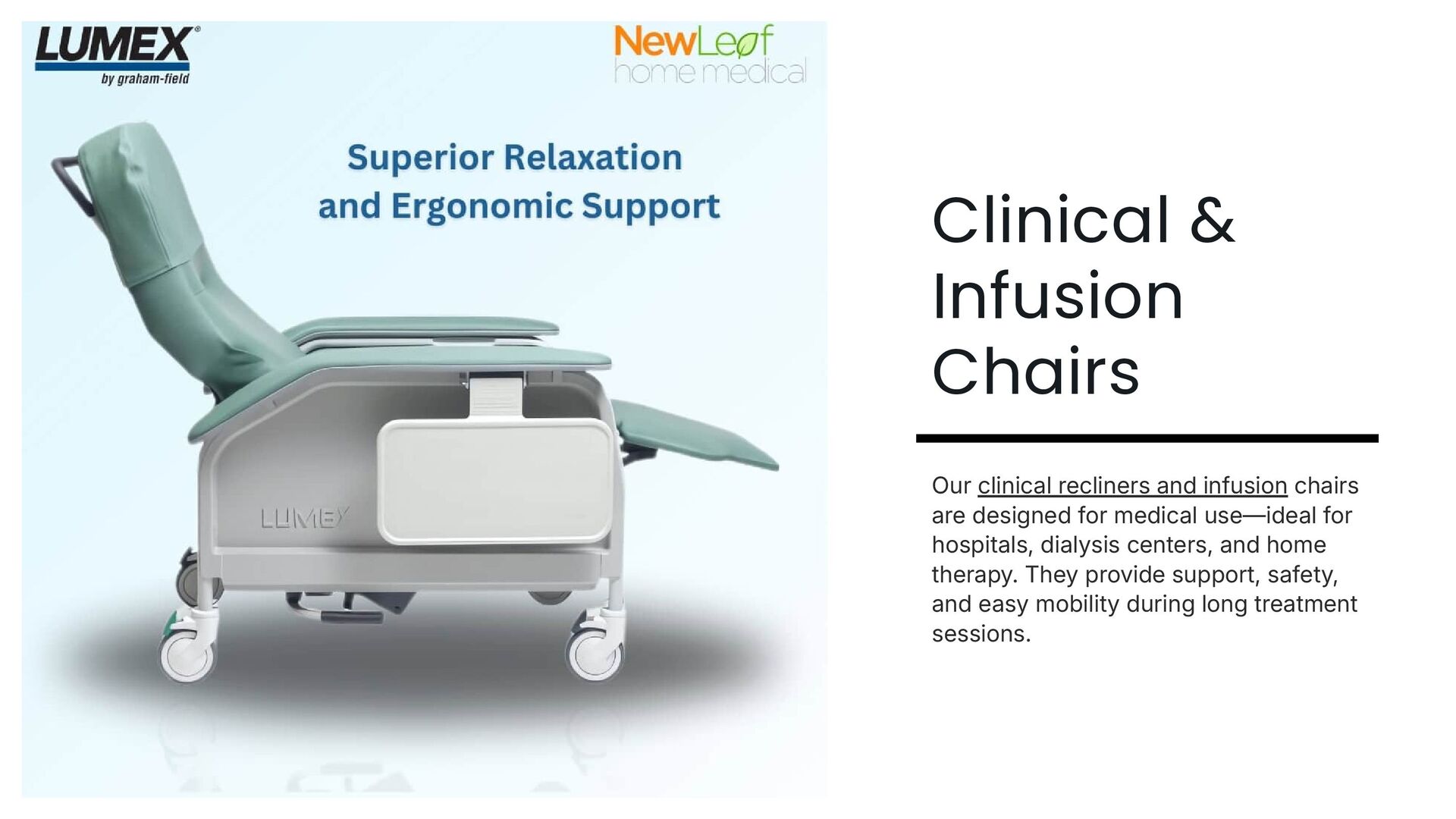 Discover a complete range of medical seating designed for comfort, mobility, and dependable support. New Leaf Home Medical offers high-quality chairs including medical recliners for home, infusion chairs, lift chairs, and specialty seating made for daily care. Each product features ergonomic design, easy-clean surfaces, and hospital-grade durability. Give your loved ones the comfort, safety, and reliability they deserve in a home-care environment.