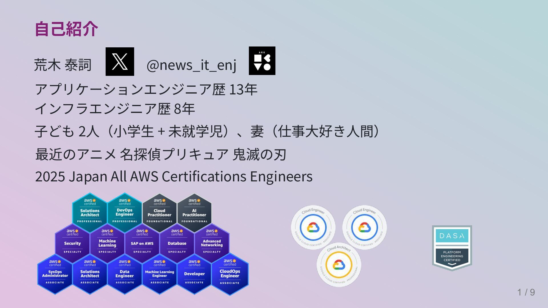 1 / 9 2025 Japan All AWS Certifications Engineers アプリケーションエンジニア歴 13年 インフラエンジニア歴 8年