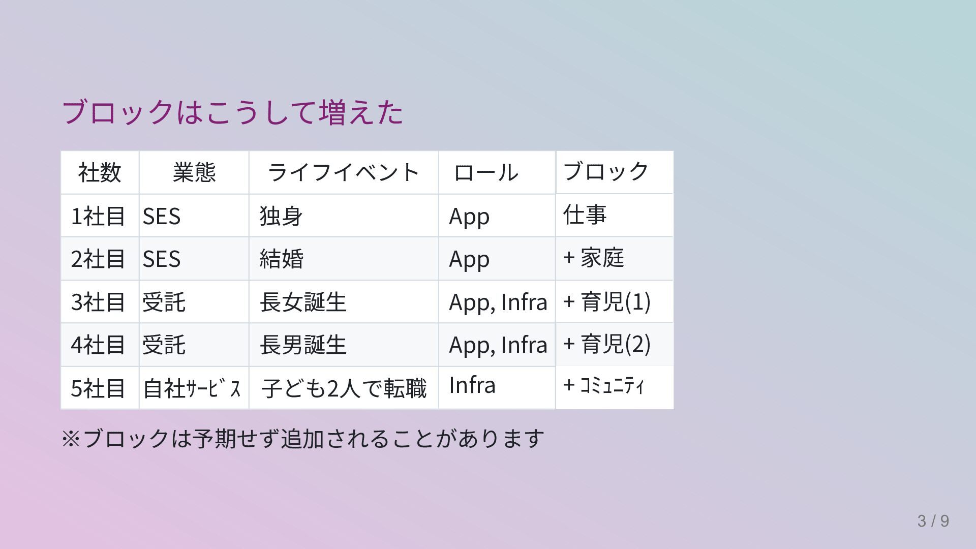 SES 結婚 App 3社⽬ 受託 ⻑⼥誕⽣ App, Infra 4社⽬ 受託 ⻑男誕⽣ App, Infra 5社⽬ ⾃社サービス ⼦ども2⼈で転職 ※ブロックは予期せず追加されることがあります 3 / 9 ブロック + 育児(1) + 育児(2) Infra ブロック 仕事 + 家庭 + 育児(1) + 育児(2) + コミュニティ