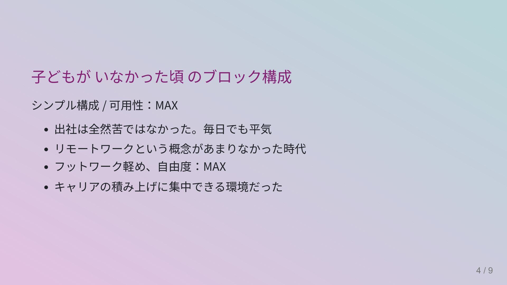 ⼦どもが いなかった頃 のブロック構成 シンプル構成 / 可⽤性:MAX 出社は全然苦ではなかった。毎⽇でも平気 リモートワークという概念があまりなかった時代 フットワーク軽め、⾃由度:MAX キャリアの積み上げに集中できる環境だった