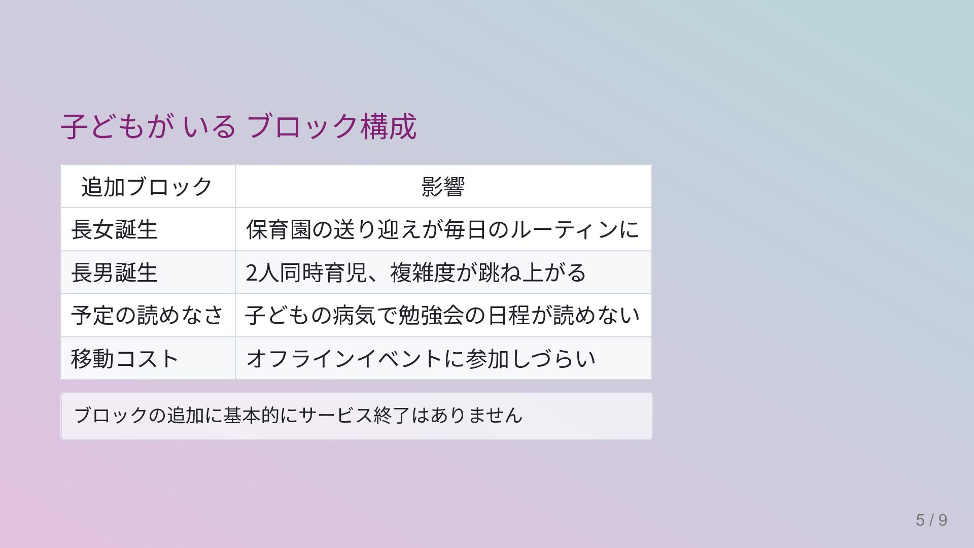 ⼦どもの病気で勉強会の⽇程が読めない 移動コスト オフラインイベントに参加しづらい ブロックの追加に基本的にサービス終了はありません 5 / 9