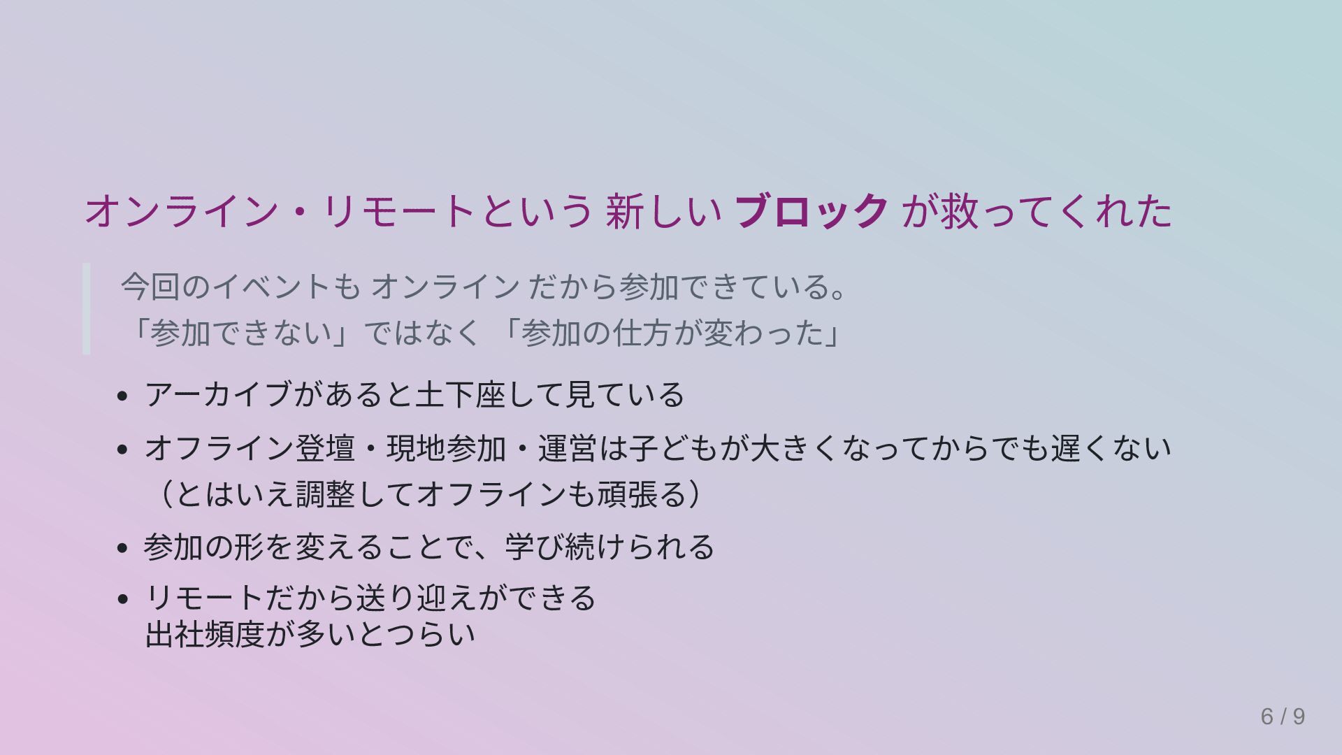 オフライン登壇‧現地参加‧運営は⼦どもが⼤きくなってからでも遅くない (とはいえ調整してオフラインも頑張る) 参加の形を変えることで、学び続けられる 6 / 9 リモートだから送り迎えができる 出社頻度が多いとつらい