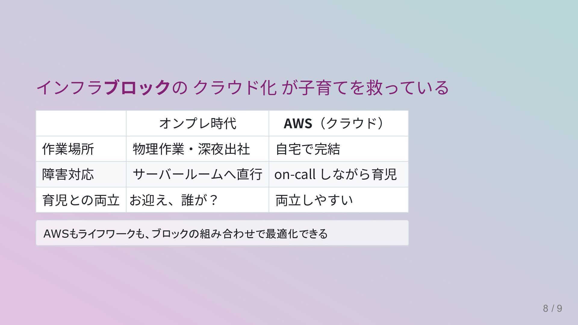 on-call しながら育児 育児との両⽴ お迎え、誰が? 両⽴しやすい AWSもライフワークも、ブロックの組み合わせで最適化できる 8 / 9
