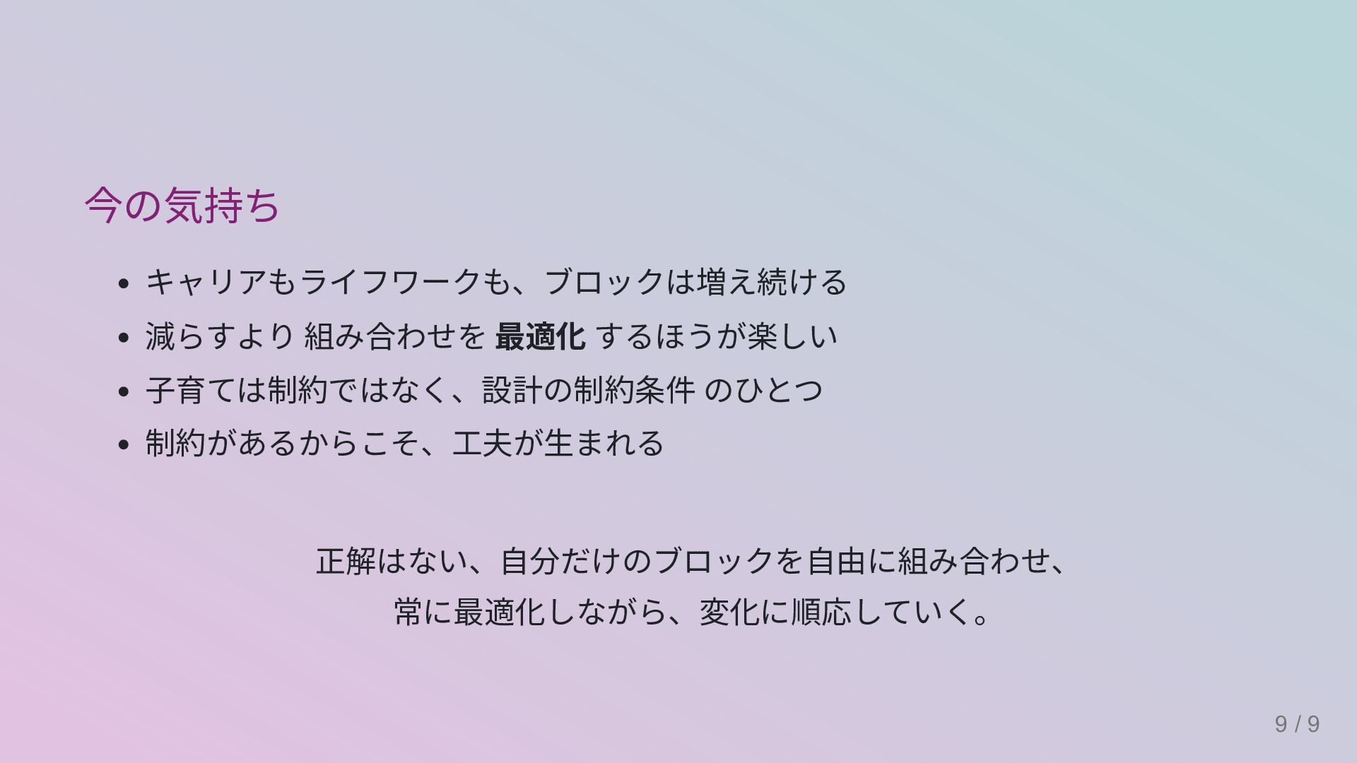 今の気持ち キャリアもライフワークも、ブロックは増え続ける 減らすより 組み合わせを 最適化 するほうが楽しい ⼦育ては制約ではなく、設計の制約条件 のひとつ 制約があるからこそ、⼯夫が⽣まれる 正解はない、⾃分だけのブロックを⾃由に組み合わせ、