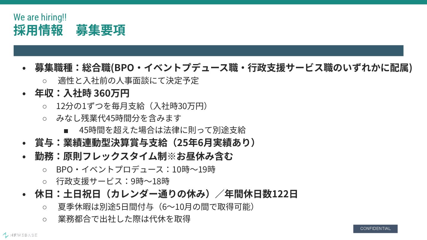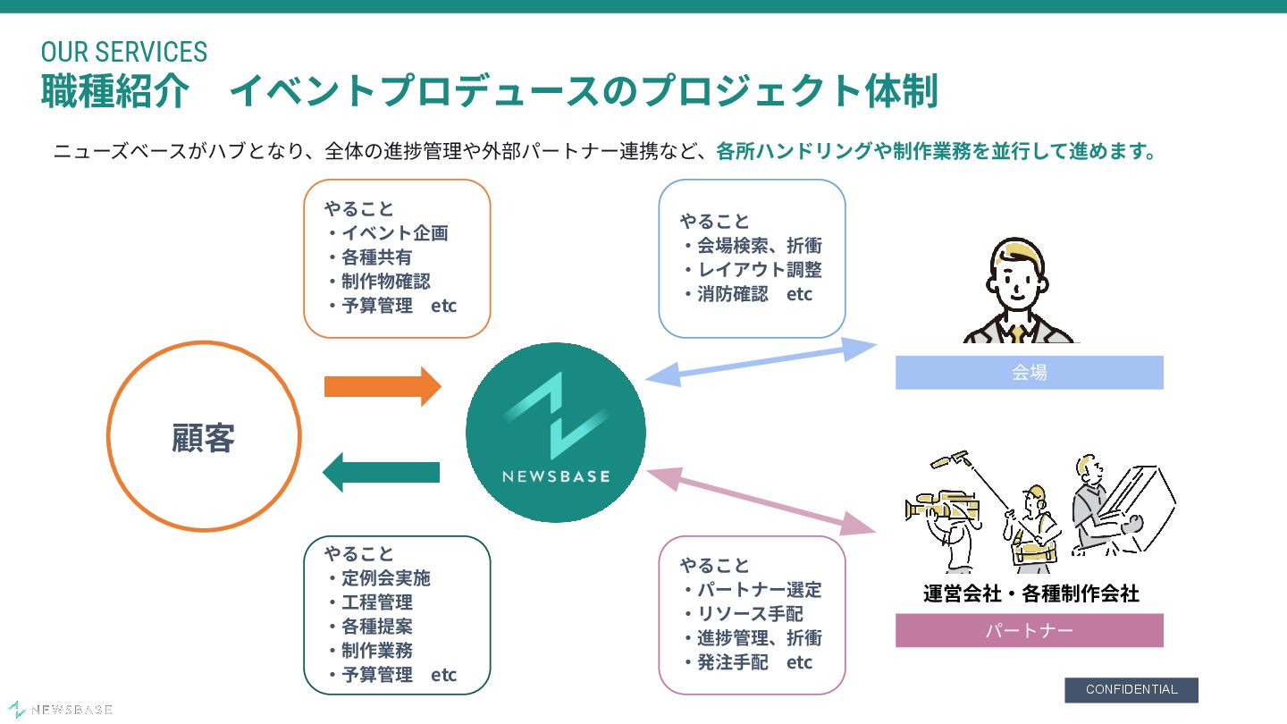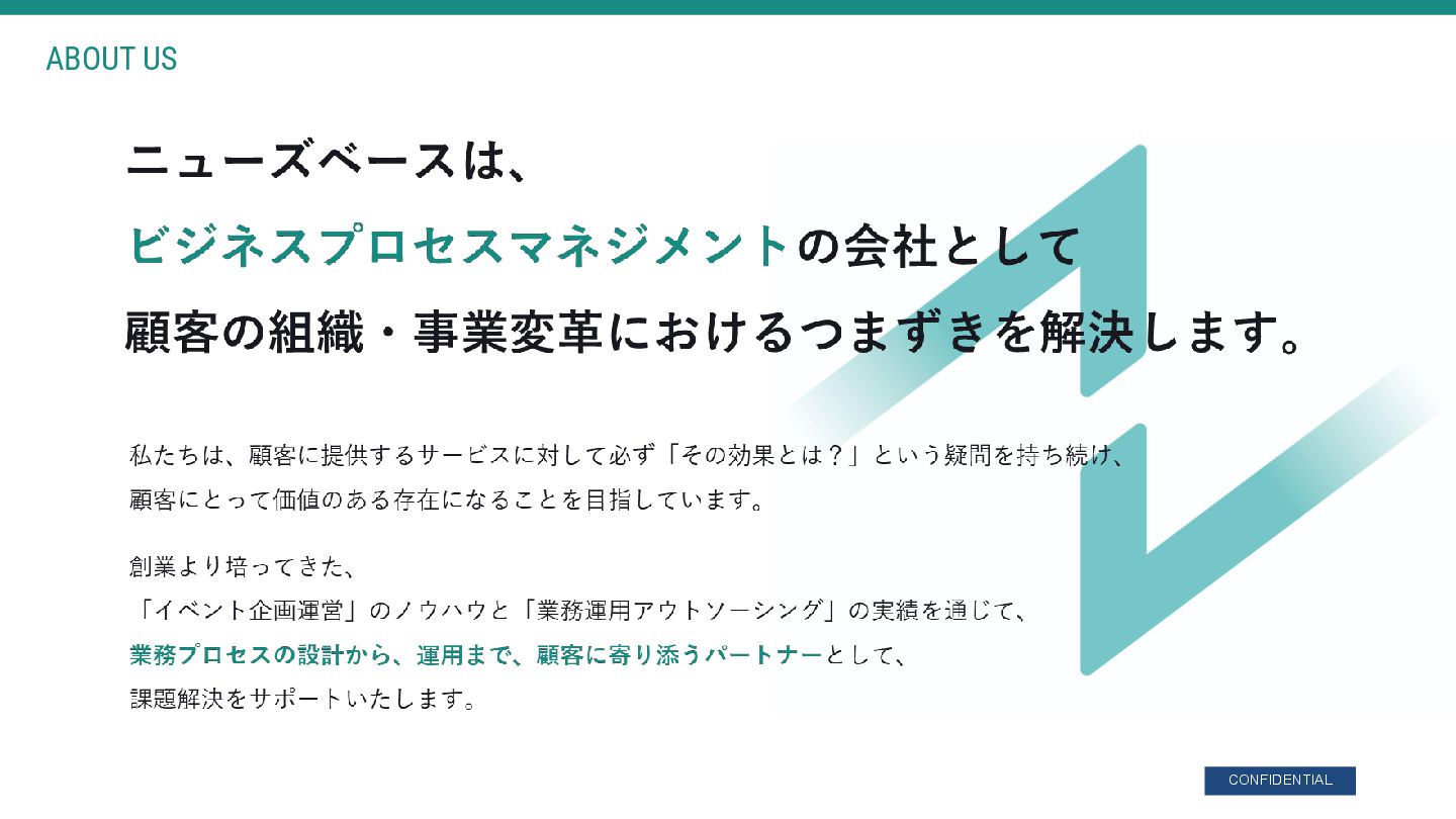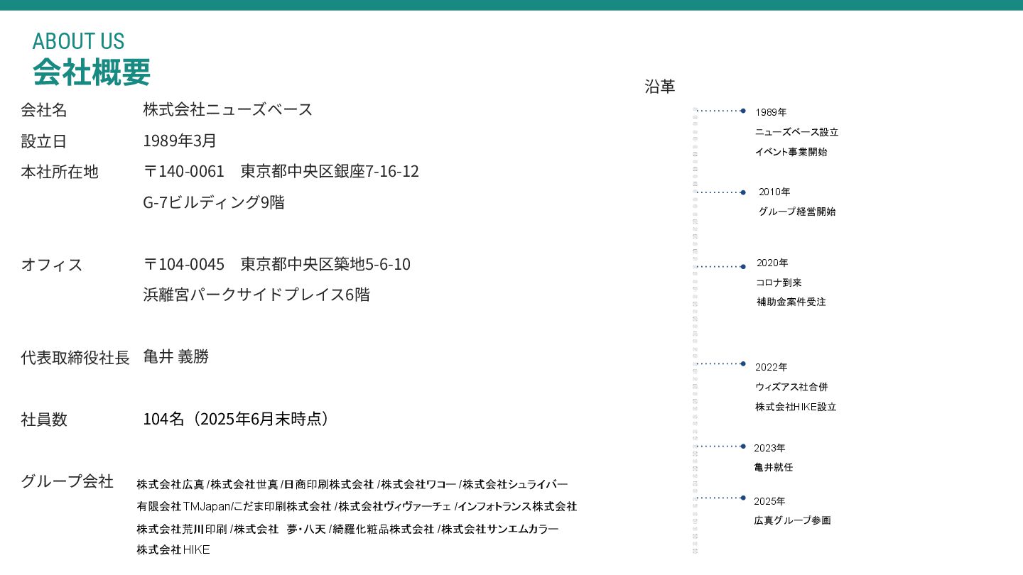 株式会社ニューズベース 1989年3⽉ 〒140-0061 東京都中央区銀座7-16-12 G-7ビルディング9階 〒104-0045 東京都中央区築地5-6-10 浜離宮パークサイドプレイス6階 ⻲井 義勝 104名(2025年6⽉末時点) 沿⾰ 株式会社広真 /株式会社世真 /日商印刷株式会社 /株式会社ワコー /株式会社シュライバー 有限会社TMJapan/こだま印刷株式会社 /株式会社ヴィヴァーチェ /インフォトランス株式会社 株式会社荒川印刷 /株式会社 夢・八天 /綺羅化粧品株式会社 /株式会社サンエムカラー 株式会社HIKE 2010年 グループ経営開始 1989年 ニューズベース設立 イベント事業開始 2020年 コロナ到来 補助金案件受注 2022年 ウィズアス社合併 株式会社HIKE設立 2023年 亀井就任 2025年 広真グループ参画