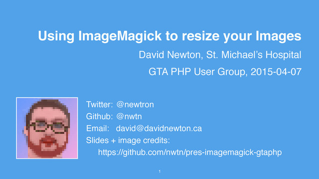 your Images GTA PHP User Group, 2015-04-07 Twitter: @newtron Github: @nwtn Email: [email protected] Slides + image credits: https://github.com/nwtn/pres-imagemagick-gtaphp