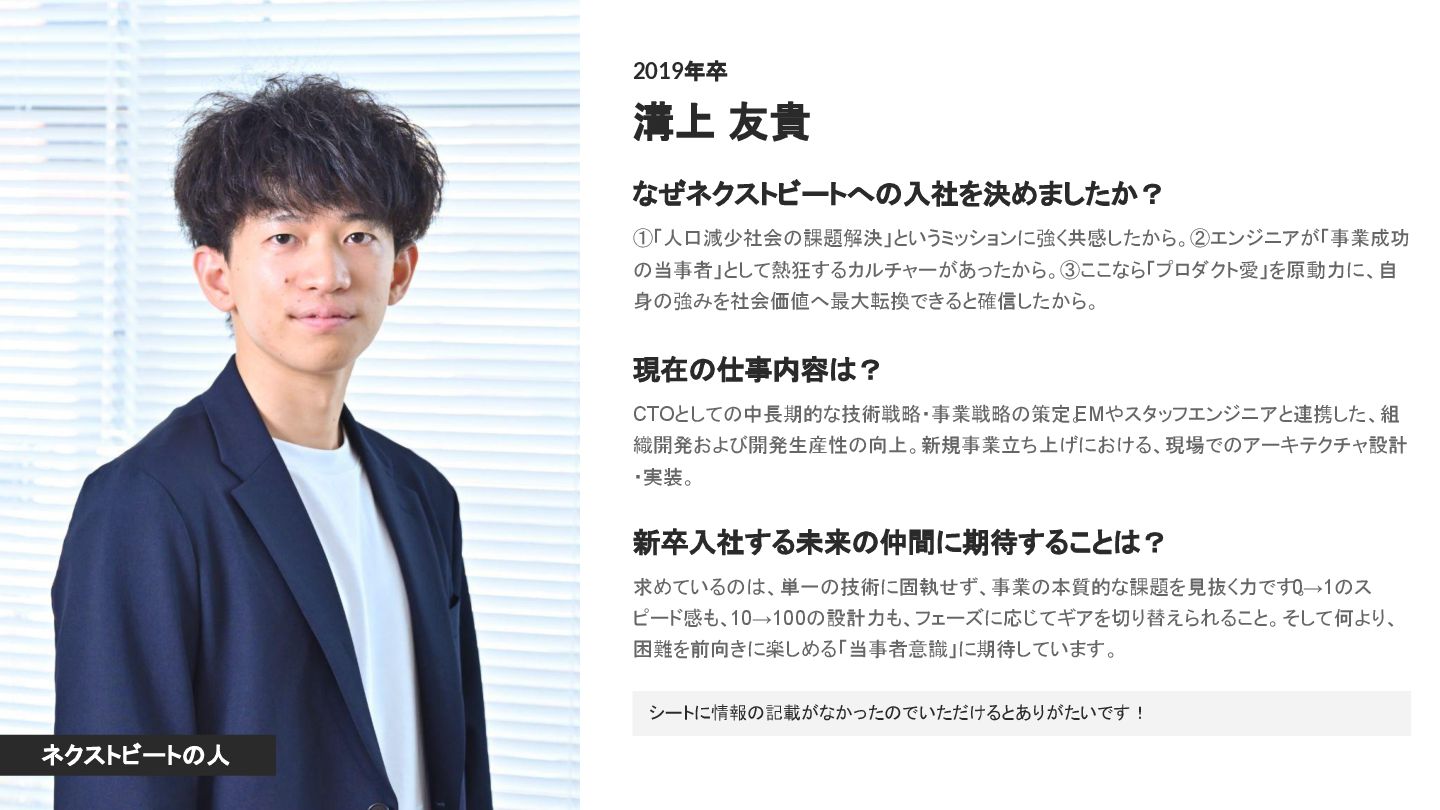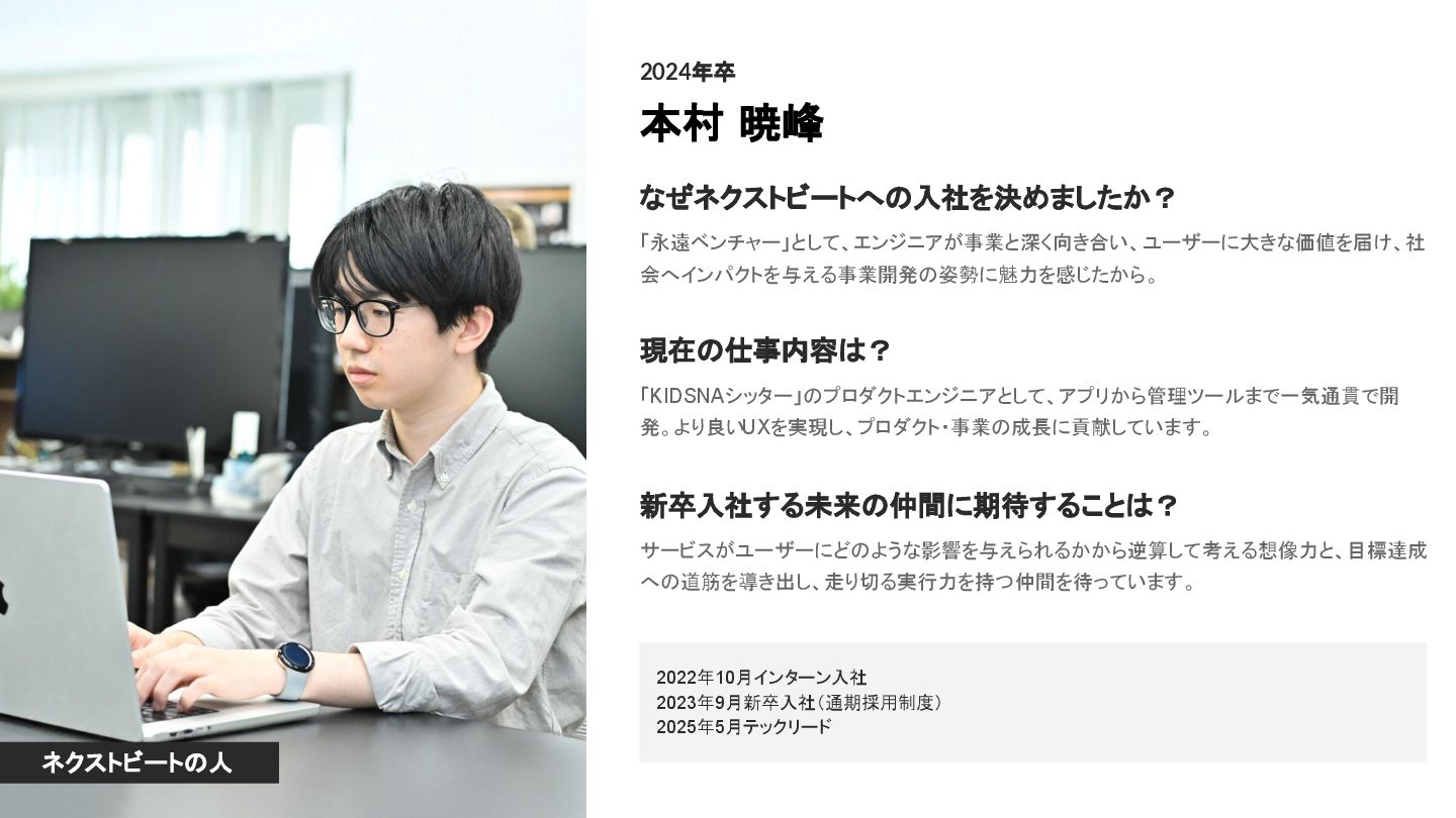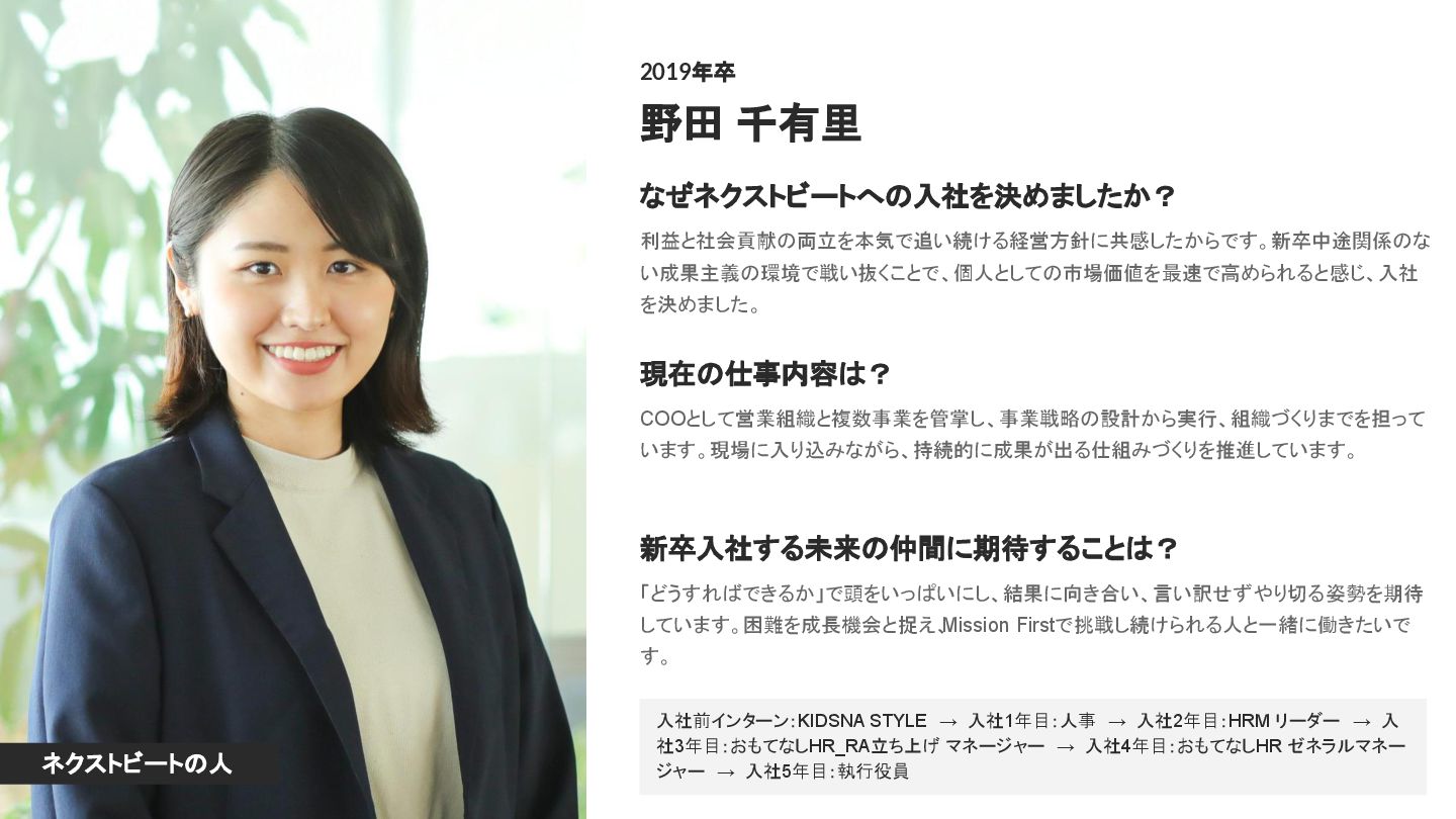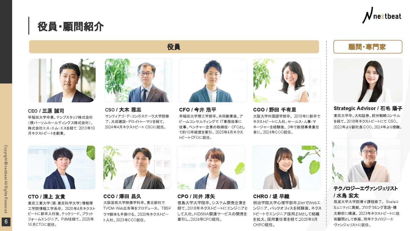 大木 雅志 サンティアゴ・デ・コンポステーラ大学院修 了。大成建設・デロイトトーマツを経て、 2024年4月ネクストビート CSOに就任。 CFO / 今井 浩平 早稲田大学理工学部卒。共同創業後、ア ビームコンサルティングで IT業務改革に 従事。ベンチャー企業の取締役・ CFOとし て約10年経営を牽引。 2025年4月ネクス トビートCFOに就任。 COO / 野田 千有里 大阪大学外国語学部卒。 2019年に新卒で ネクストビートに入社。セールス・人事・マ ネージャーを経験後、 3年で新規事業責任 者に。2024年COO就任。 役員 顧問・専門家 CCO / 澤田 昌久 大阪芸術大学映像学科卒。東北新社で TVCM・Web広告等をプロデュース。 TBSド ラマ脚本も手掛ける。 2020年ネクストビー ト入社、2023年CCO就任。 CPO / 川井 淳矢 徳島大学大学院卒。システム開発企業を 経て、2018年ネクストビートにエンジニアと して入社。KIDSNA関連サービスの開発を 牽引し、2024年CPO就任。 Strategic Advisor / 石毛 陽子 東京大学卒。大和証券、欧州戦略コンサル を経て、2018年ネクストビートにて CSO、 2022年より副社長 COO、2024年より現職。 テクノロジーエヴァンジェリスト / 水島 宏太 筑波大学大学院博士課程修了。 Scalaコ ミュニティに貢献。プログラミング言語・構 文解析に精通。 2023年ネクストビートに技 術顧問として参画、同年テクノロジーエ ヴァンジェリストに就任。 CTO / 溝上 友貴 東京工業大学(現:東京科学大学)情報理 工学院情報工学系卒。 2020年4月ネクスト ビートに新卒入社後、テックリード、プラット フォームエンジニア、 PdMを経て、2025年 10月CTOに就任。 CHRO / 堤 早織 明治学院大学心理学部卒。 SIerでWebエ ンジニア、バックオフィスを経験後、ネクス トビートでエンジニア採用、 EMとして組織 を拡大、採用責任者を経て、 2025年6月 CHRO就任。 CEO / 三原 誠司 早稲田大学卒業。テンプスタッフ株式会社 (現パーソルホールディングス株式会社)、 株式会社エス・エム・エスを経て 2013年10 月ネクストビートを創業。