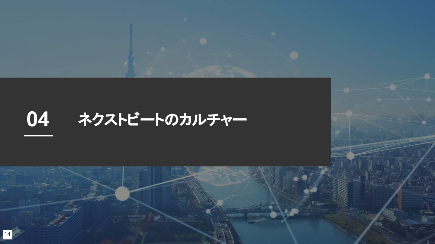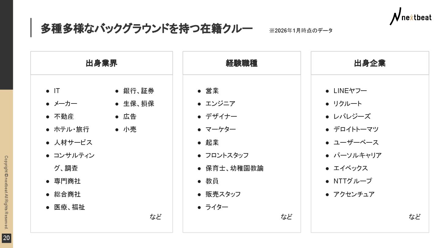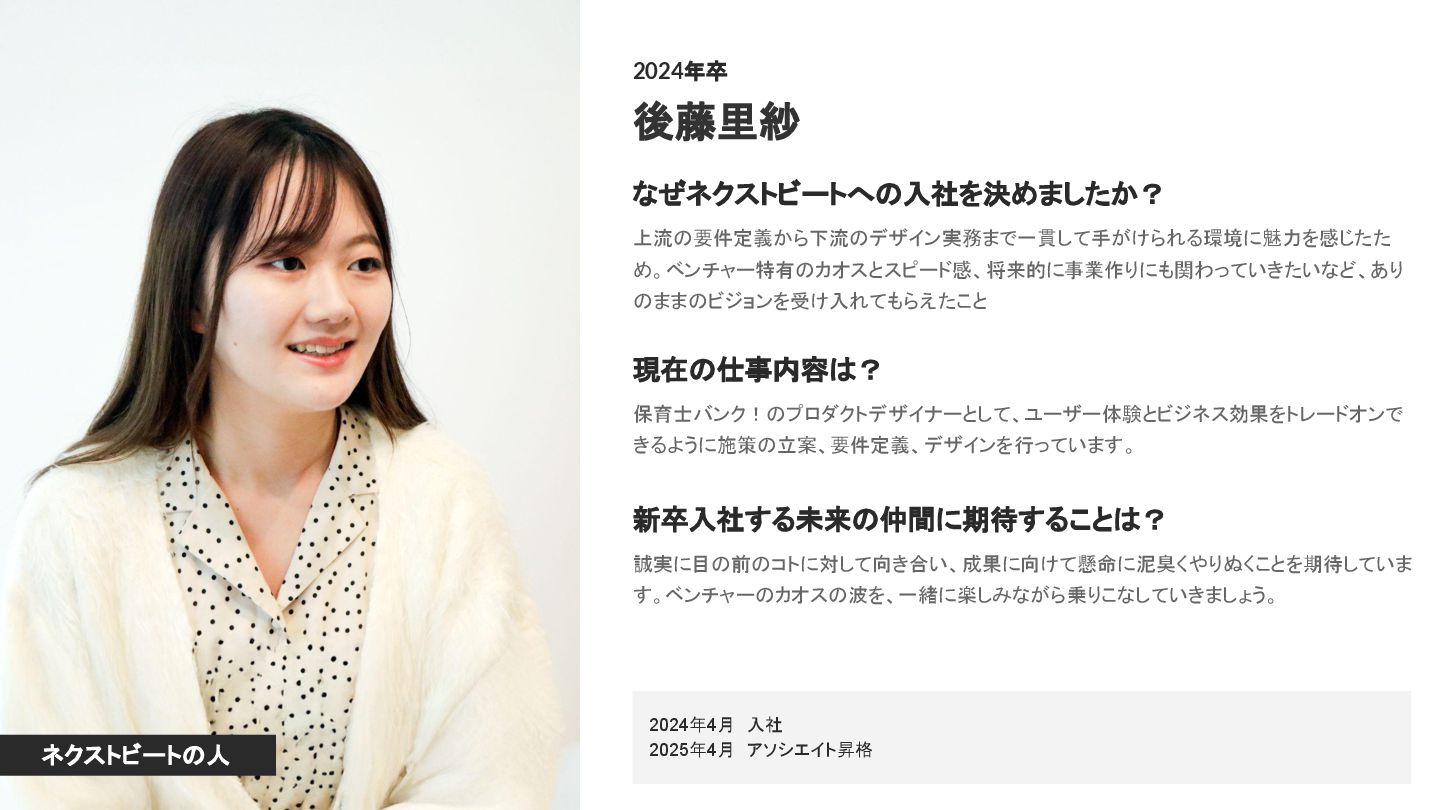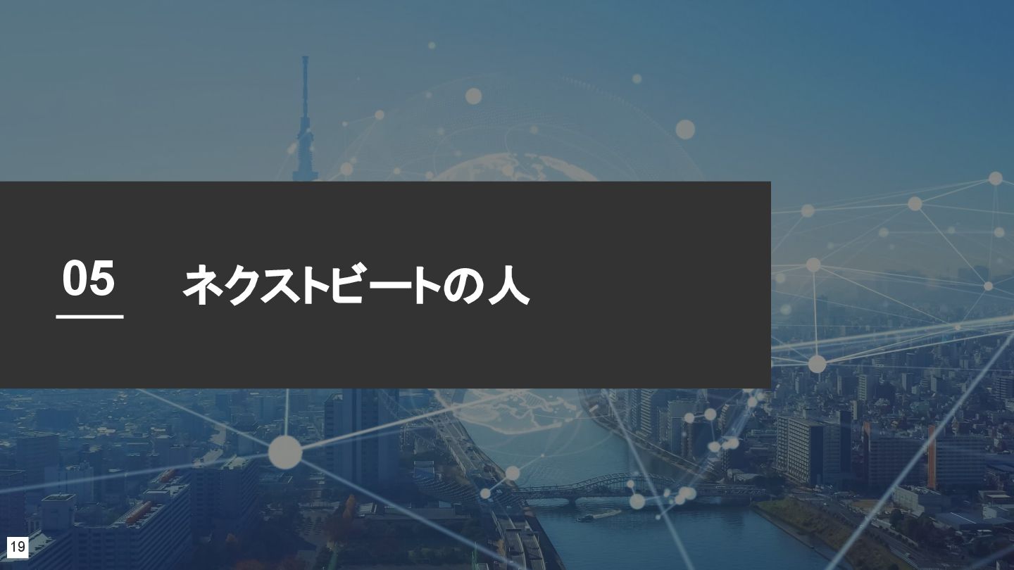 大木 雅志 サンティアゴ・デ・コンポステーラ大学院修 了。大成建設・デロイトトーマツを経て、 2024年4月ネクストビート CSOに就任。 CFO / 今井 浩平 早稲田大学理工学部卒。共同創業後、ア ビームコンサルティングで IT業務改革に 従事。ベンチャー企業の取締役・ CFOとし て約10年経営を牽引。 2025年4月ネクス トビートCFOに就任。 COO / 野田 千有里 大阪大学外国語学部卒。 2019年に新卒で ネクストビートに入社。セールス・人事・マ ネージャーを経験後、 3年で新規事業責任 者に。2024年COO就任。 役員 顧問・専門家 CCO / 澤田 昌久 大阪芸術大学映像学科卒。東北新社で TVCM・Web広告等をプロデュース。 TBSド ラマ脚本も手掛ける。 2020年ネクストビー ト入社、2023年CCO就任。 CPO / 川井 淳矢 徳島大学大学院卒。システム開発企業を 経て、2018年ネクストビートにエンジニアと して入社。KIDSNA関連サービスの開発を 牽引し、2024年CPO就任。 Strategic Advisor / 石毛 陽子 東京大学卒。大和証券、欧州戦略コンサル を経て、2018年ネクストビートにて CSO、 2022年より副社長 COO、2024年より現職。 テクノロジーエヴァンジェリスト / 水島 宏太 筑波大学大学院博士課程修了。 Scalaコ ミュニティに貢献。プログラミング言語・構 文解析に精通。 2023年ネクストビートに技 術顧問として参画、同年テクノロジーエ ヴァンジェリストに就任。 CTO / 溝上 友貴 東京工業大学(現:東京科学大学)情報理 工学院情報工学系卒。 2020年4月ネクスト ビートに新卒入社後、テックリード、プラット フォームエンジニア、 PdMを経て、2025年 10月CTOに就任。 CHRO / 堤 早織 明治学院大学心理学部卒。 SIerでWebエ ンジニア、バックオフィスを経験後、ネクス トビートでエンジニア採用、 EMとして組織 を拡大、採用責任者を経て、 2025年6月 CHRO就任。 CEO / 三原 誠司 早稲田大学卒業。テンプスタッフ株式会社 (現パーソルホールディングス株式会社)、 株式会社エス・エム・エスを経て 2013年10 月ネクストビートを創業。