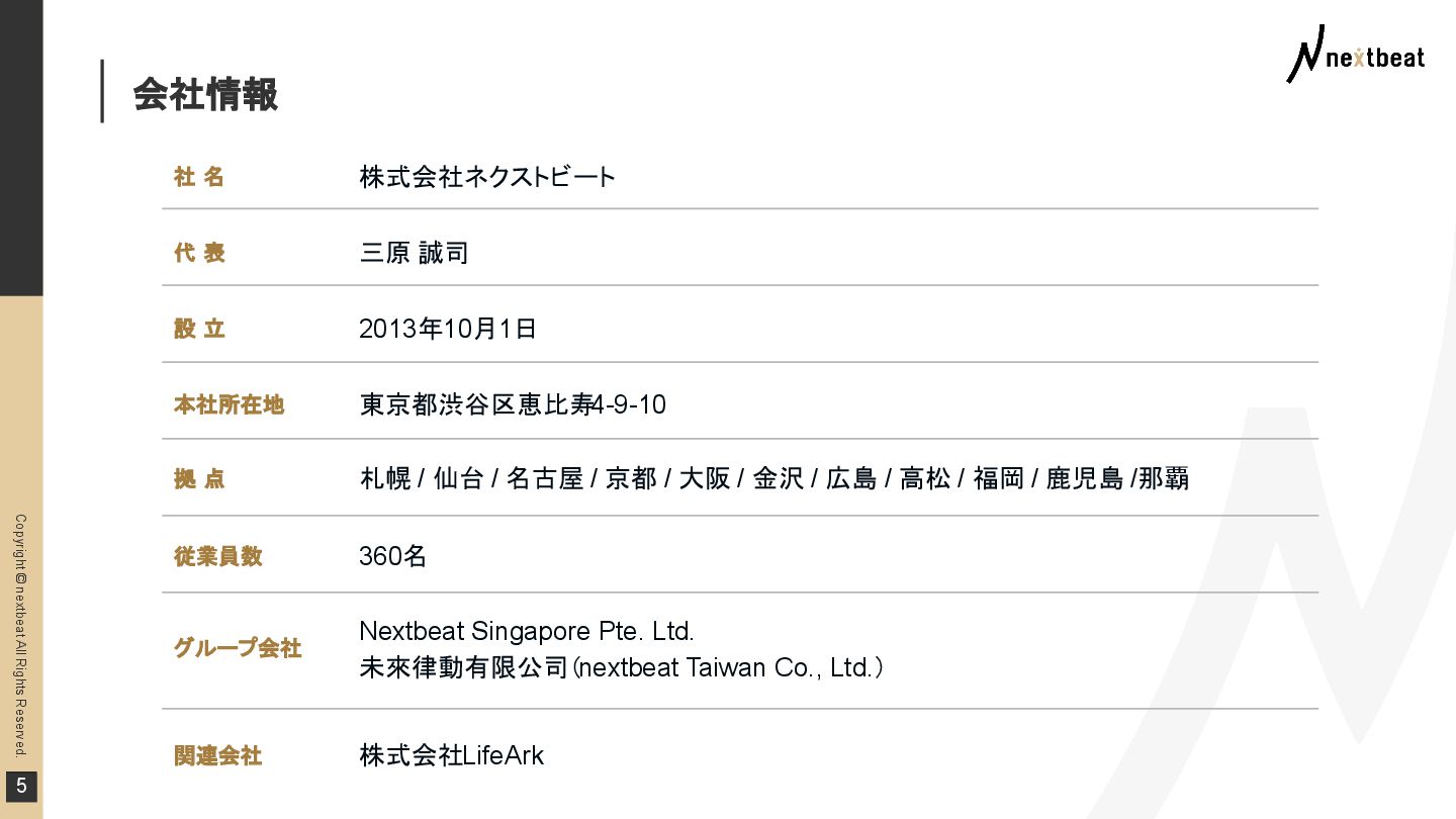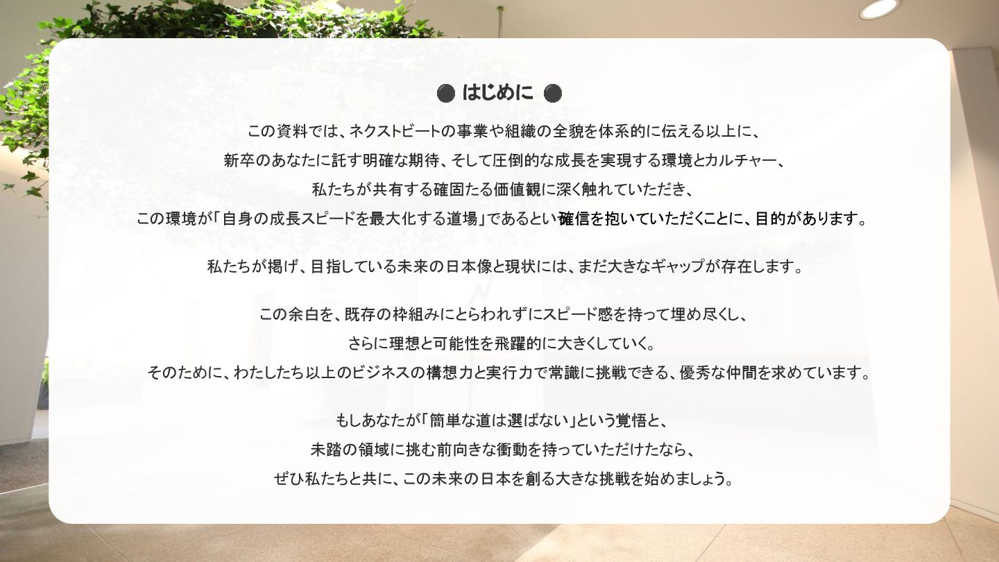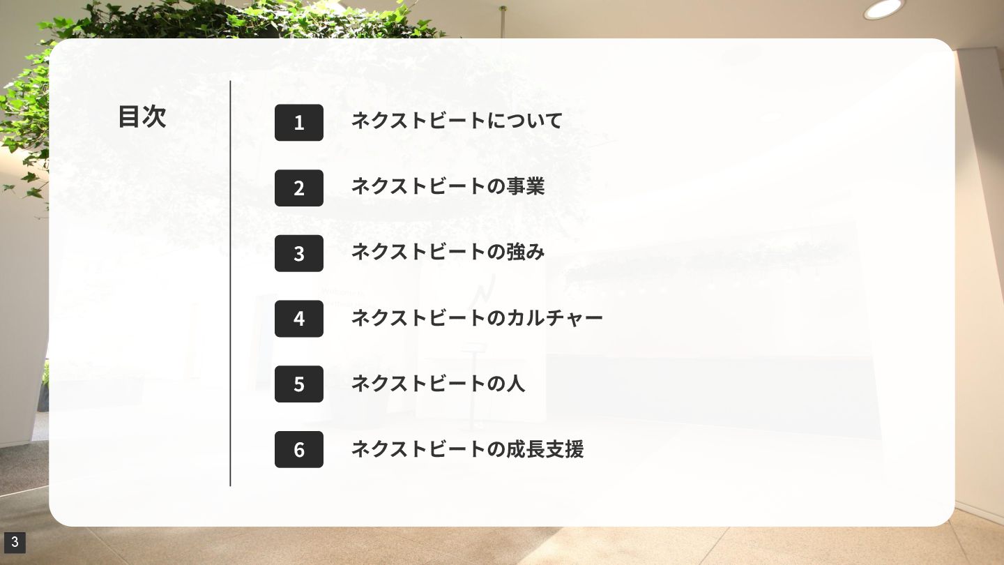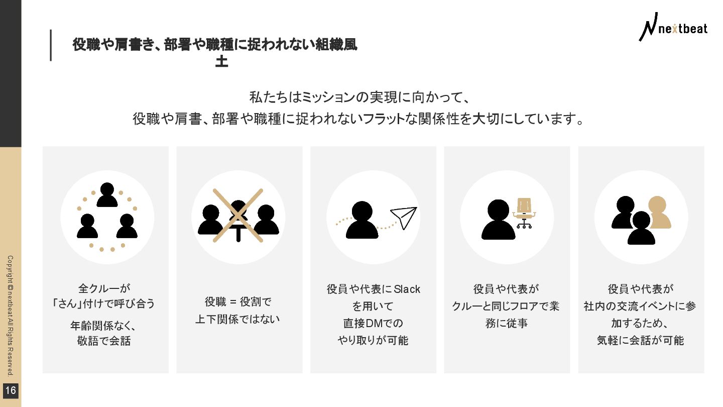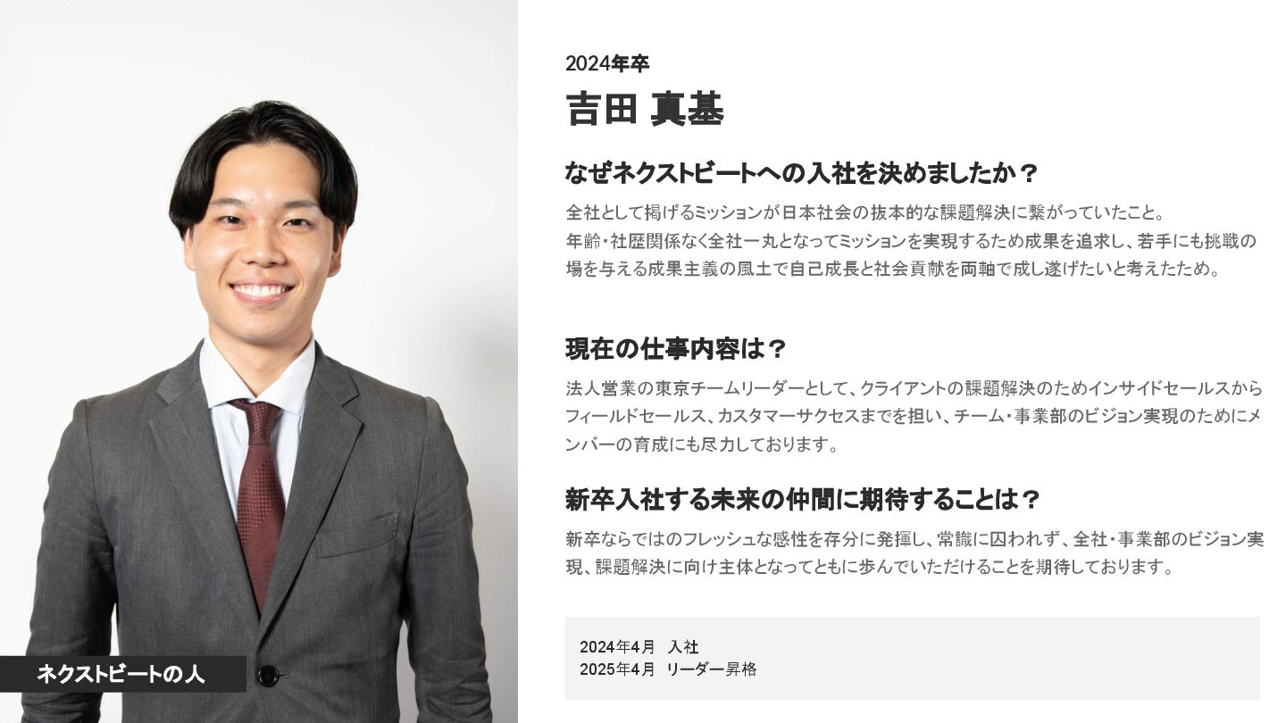 大木 雅志 サンティアゴ・デ・コンポステーラ大学院修 了。大成建設・デロイトトーマツを経て、 2024年4月ネクストビート CSOに就任。 CFO / 今井 浩平 早稲田大学理工学部卒。共同創業後、ア ビームコンサルティングで IT業務改革に 従事。ベンチャー企業の取締役・ CFOとし て約10年経営を牽引。 2025年4月ネクス トビートCFOに就任。 COO / 野田 千有里 大阪大学外国語学部卒。 2019年に新卒で ネクストビートに入社。セールス・人事・マ ネージャーを経験後、 3年で新規事業責任 者に。2024年COO就任。 役員 顧問・専門家 CCO / 澤田 昌久 大阪芸術大学映像学科卒。東北新社で TVCM・Web広告等をプロデュース。 TBSド ラマ脚本も手掛ける。 2020年ネクストビー ト入社、2023年CCO就任。 CPO / 川井 淳矢 徳島大学大学院卒。システム開発企業を 経て、2018年ネクストビートにエンジニアと して入社。KIDSNA関連サービスの開発を 牽引し、2024年CPO就任。 Strategic Advisor / 石毛 陽子 東京大学卒。大和証券、欧州戦略コンサル を経て、2018年ネクストビートにて CSO、 2022年より副社長 COO、2024年より現職。 テクノロジーエヴァンジェリスト / 水島 宏太 筑波大学大学院博士課程修了。 Scalaコ ミュニティに貢献。プログラミング言語・構 文解析に精通。 2023年ネクストビートに技 術顧問として参画、同年テクノロジーエ ヴァンジェリストに就任。 CTO / 溝上 友貴 東京工業大学(現:東京科学大学)情報理 工学院情報工学系卒。 2020年4月ネクスト ビートに新卒入社後、テックリード、プラット フォームエンジニア、 PdMを経て、2025年 10月CTOに就任。 CHRO / 堤 早織 明治学院大学心理学部卒。 SIerでWebエ ンジニア、バックオフィスを経験後、ネクス トビートでエンジニア採用、 EMとして組織 を拡大、採用責任者を経て、 2025年6月 CHRO就任。 CEO / 三原 誠司 早稲田大学卒業。テンプスタッフ株式会社 (現パーソルホールディングス株式会社)、 株式会社エス・エム・エスを経て 2013年10 月ネクストビートを創業。