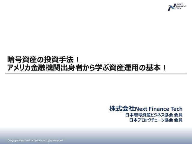 Tech Co. All rights reserved. 暗号資産の投資手法! アメリカ金融機関出身者から学ぶ資産運用の基本!