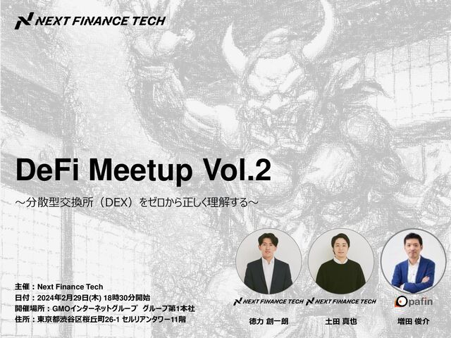 Strictly Confidential DeFi Meetup Vol.2 ~分散型交換所(DEX)をゼロから正しく理解する~ 主催:Next Finance Tech 日付:2024年2月29日(木) 18時30分開始 開催場所:GMOインターネットグループ グループ第1本社 住所:東京都渋谷区桜丘町26-1 セルリアンタワー11階 徳力 創一朗 土田 真也 増田 俊介