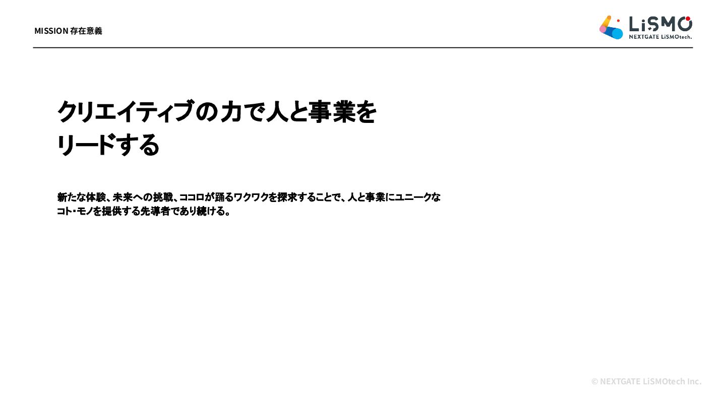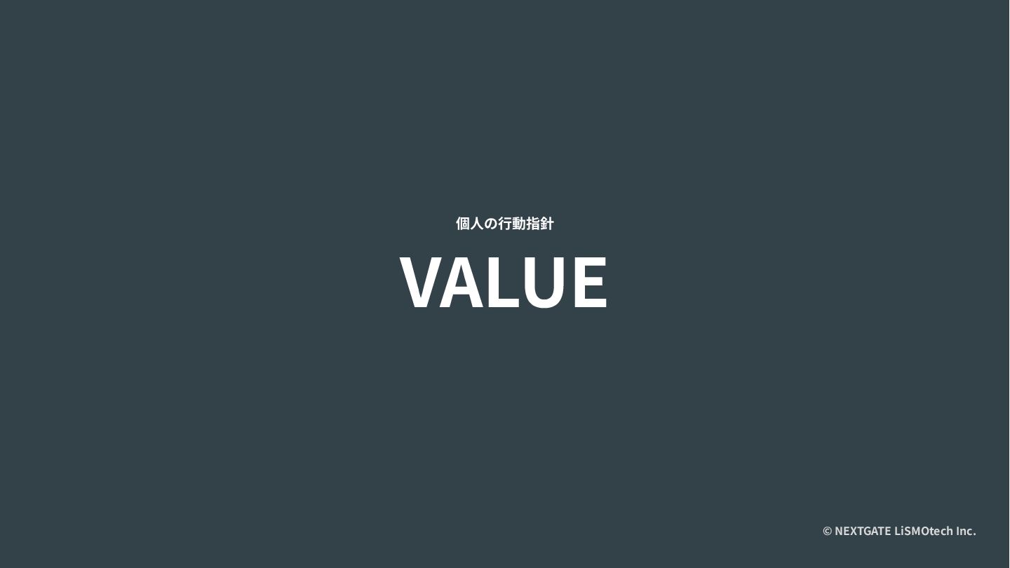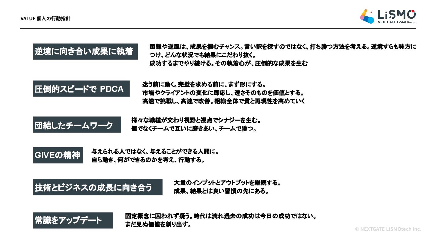 逆境に向き合い成果に執着 圧倒的スピードで PDCA 困難や逆風は、成果を掴むチャンス。言い訳を探すのではなく、打ち勝つ方法を考える。逆境すらも味方に つけ、どんな状況でも結果にこだわり抜く。 成功するまでやり続ける。その執着心が、圧倒的な成果を生む 迷う前に動く。完璧を求める前に、まず形にする。 市場やクライアントの変化に即応し、速さそのものを価値とする。 高速で挑戦し、高速で改善。組織全体で質と再現性を高めていく 様々な職種が交わり視野と視点でシナジーを生む。 個でなくチームで互いに磨きあい、チームで勝つ。 与えられる人ではなく、与えることができる人間に。 自ら動き、何ができるのかを考え、行動する。 大量のインプットとアウトプットを継続する。 成果、結果とは良い習慣の先にある。 固定概念に囚われず疑う。時代は流れ過去の成功は今日の成功ではない。 まだ見ぬ価値を創り出す。