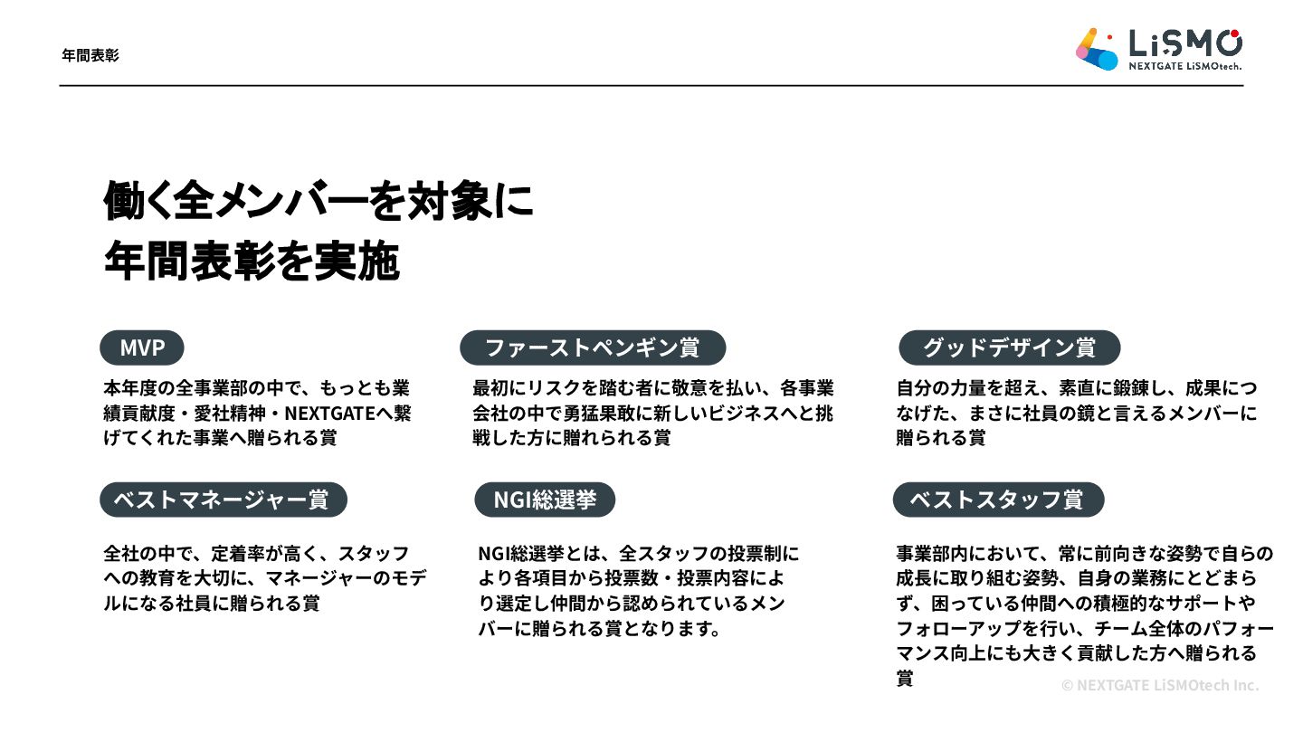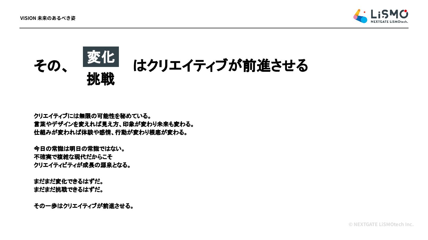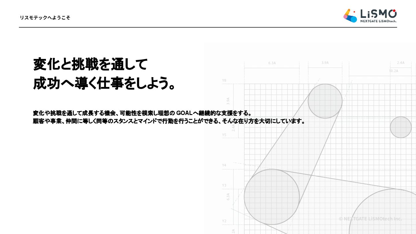 逆境に向き合い成果に執着 圧倒的スピードで PDCA 困難や逆風は、成果を掴むチャンス。言い訳を探すのではなく、打ち勝つ方法を考える。逆境すらも味方に つけ、どんな状況でも結果にこだわり抜く。 成功するまでやり続ける。その執着心が、圧倒的な成果を生む 迷う前に動く。完璧を求める前に、まず形にする。 市場やクライアントの変化に即応し、速さそのものを価値とする。 高速で挑戦し、高速で改善。組織全体で質と再現性を高めていく 様々な職種が交わり視野と視点でシナジーを生む。 個でなくチームで互いに磨きあい、チームで勝つ。 与えられる人ではなく、与えることができる人間に。 自ら動き、何ができるのかを考え、行動する。 大量のインプットとアウトプットを継続する。 成果、結果とは良い習慣の先にある。 固定概念に囚われず疑う。時代は流れ過去の成功は今日の成功ではない。 まだ見ぬ価値を創り出す。