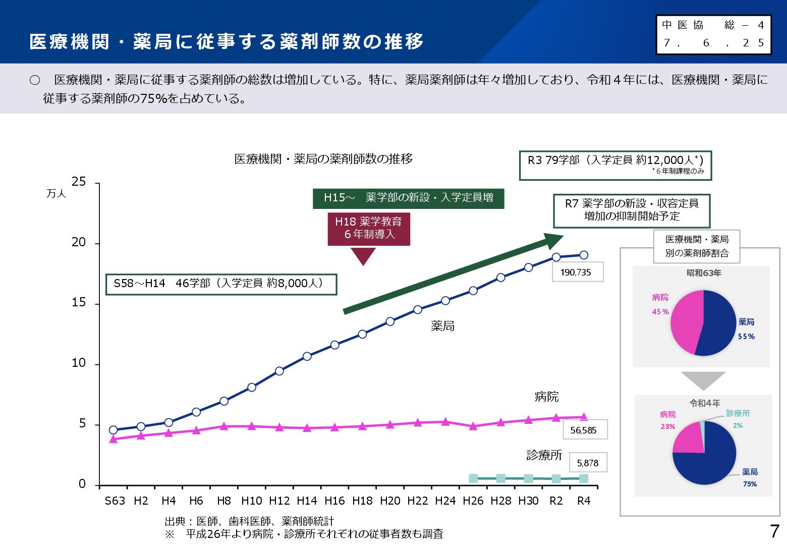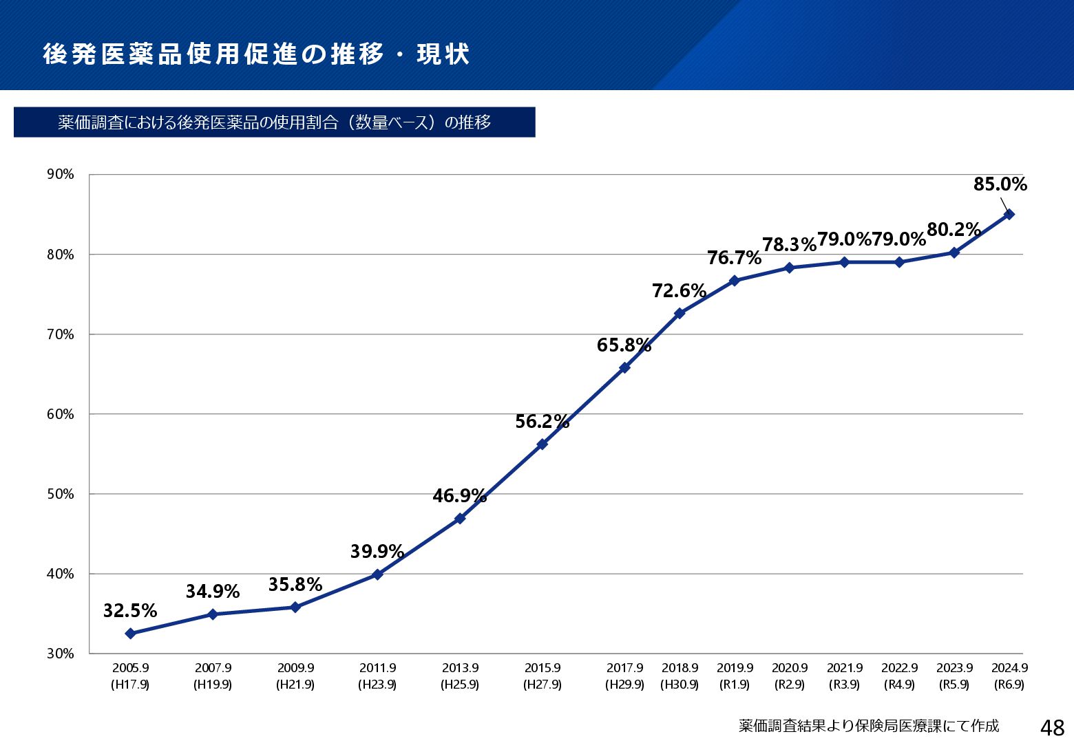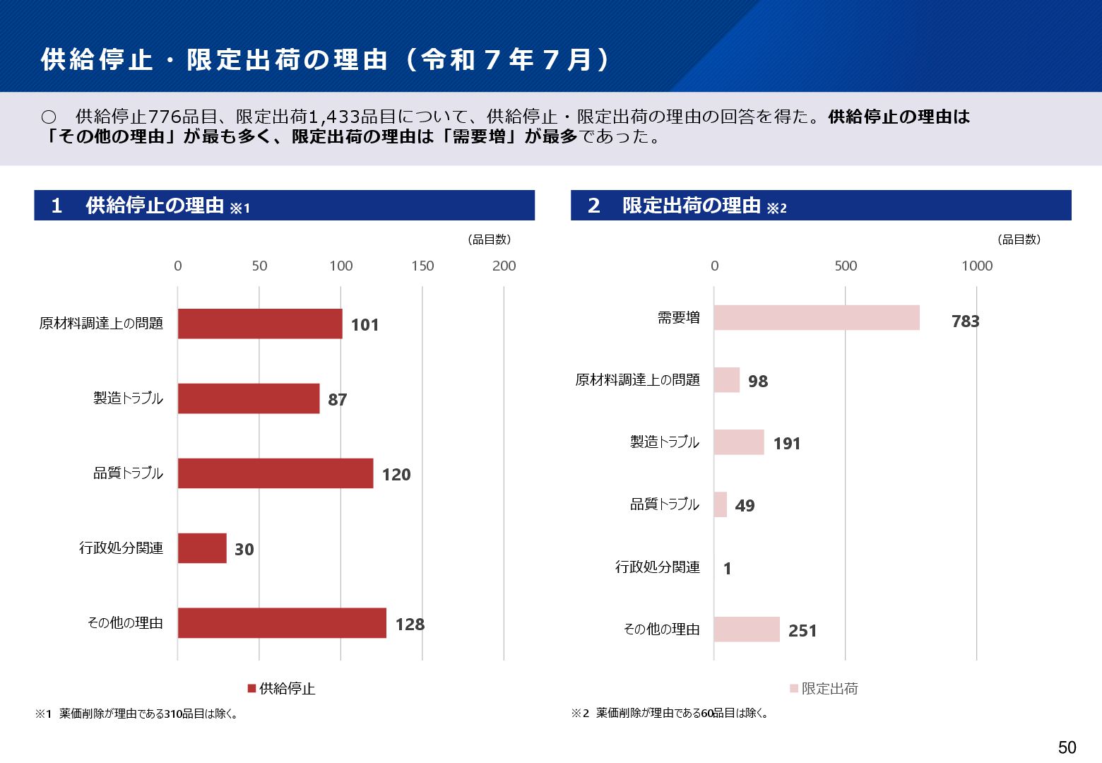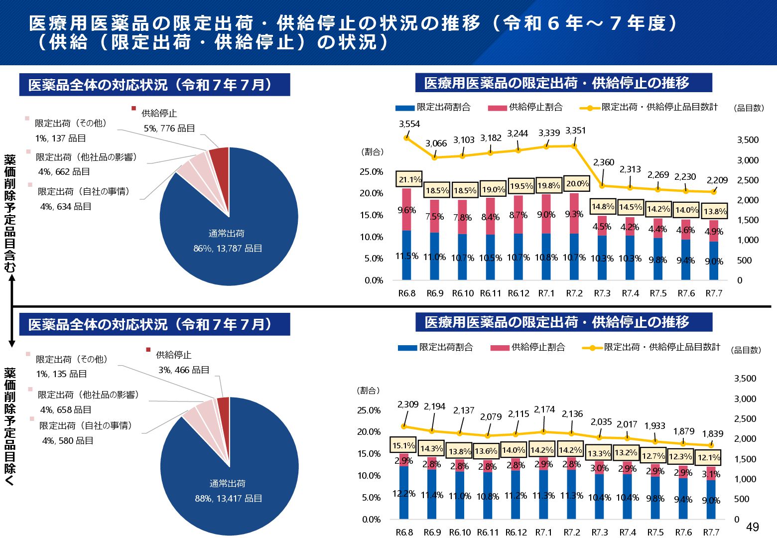 9.4% 9.0% 2.9% 2.8% 2.8% 2.8% 2.8% 2.9% 2.8% 3.0% 2.9% 2.9% 2.9% 3.1% 2,309 2,194 2,137 2,079 2,115 2,174 2,136 2,035 2,017 1,933 1,879 1,839 0 500 1,000 1,500 2,000 2,500 3,000 3,500 0.0% 5.0% 10.0% 15.0% 20.0% 25.0% 30.0% 35.0% R6.8 R6.9 R6.10 R6.11 R6.12 R7.1 R7.2 R7.3 R7.4 R7.5 R7.6 R7.7 限定出荷割合 供給停止割合 限定出荷・供給停止品目数計 11.5% 11.0% 10.7% 10.5% 10.7% 10.8% 10.7% 10.3% 10.3% 9.8% 9.4% 9.0% 9.6% 7.5% 7.8% 8.4% 8.7% 9.0% 9.3% 4.5% 4.2% 4.4% 4.6% 4.9% 3,554 3,066 3,103 3,182 3,244 3,339 3,351 2,360 2,313 2,269 2,230 2,209 0 500 1,000 1,500 2,000 2,500 3,000 3,500 0.0% 5.0% 10.0% 15.0% 20.0% 25.0% 30.0% 35.0% R6.8 R6.9 R6.10 R6.11 R6.12 R7.1 R7.2 R7.3 R7.4 R7.5 R7.6 R7.7 限定出荷割合 供給停止割合 限定出荷・供給停止品目数計 通常出荷 88%, 13,417 品目 限定出荷(自社の事情) 4%, 580 品目 限定出荷(他社品の影響) 4%, 658 品目 限定出荷(その他) 1%, 135 品目 供給停止 3%, 466 品目 通常出荷 86%, 13,787 品目 限定出荷(自社の事情) 4%, 634 品目 限定出荷(他社品の影響) 4%, 662 品目 限定出荷(その他) 1%, 137 品目 供給停止 5%, 776 品目 医 療 用 医 薬 品 の 限 定 出 荷・ 供 給停 止 の状 況 の推 移 (令 和 6年 ~ 7年 度 ) ( 供 給 ( 限 定 出 荷 ・ 供 給停 止 )の 状 況) 薬 価 削 除 予 定 品 目 含 む 薬 価 削 除 予 定 品 目 除 く 医療用医薬品の限定出荷・供給停止の推移 医薬品全体の対応状況(令和7年7月) 医薬品全体の対応状況(令和7年7月) 19.5% 19.8% 14.8% 14.5% 14.2% 14.0% 20.0% 13.8% 21.1% 18.5% 18.5% 19.0% 医療用医薬品の限定出荷・供給停止の推移 14.0% 14.2% 14.2% 13.3% 13.2% 12.7% 12.3% 12.1% 15.1% 14.3% 13.8% 13.6% (割合) (品目数) (割合) (品目数) 49