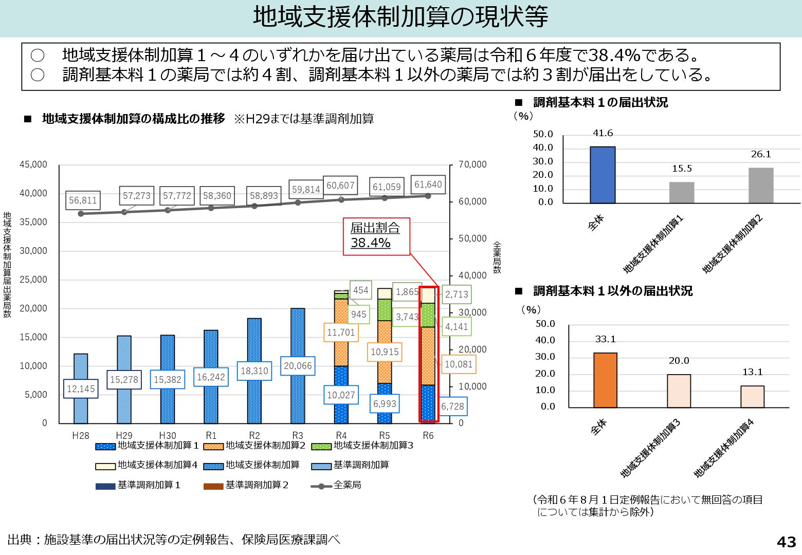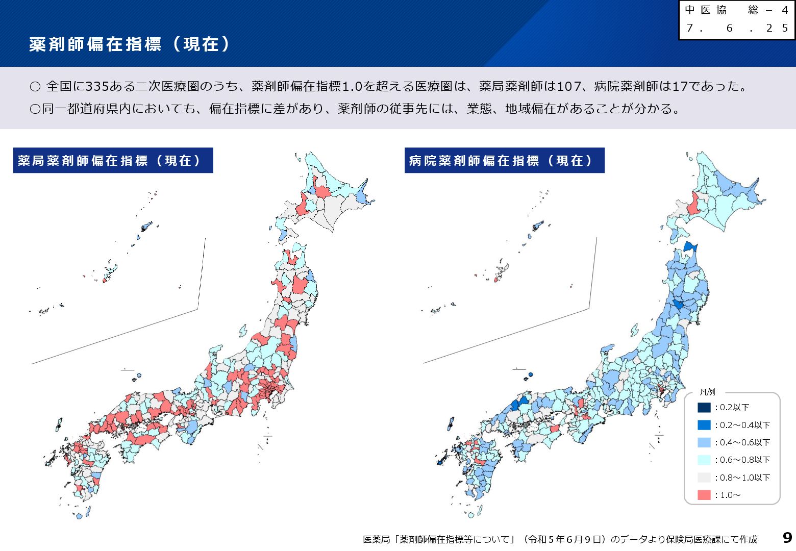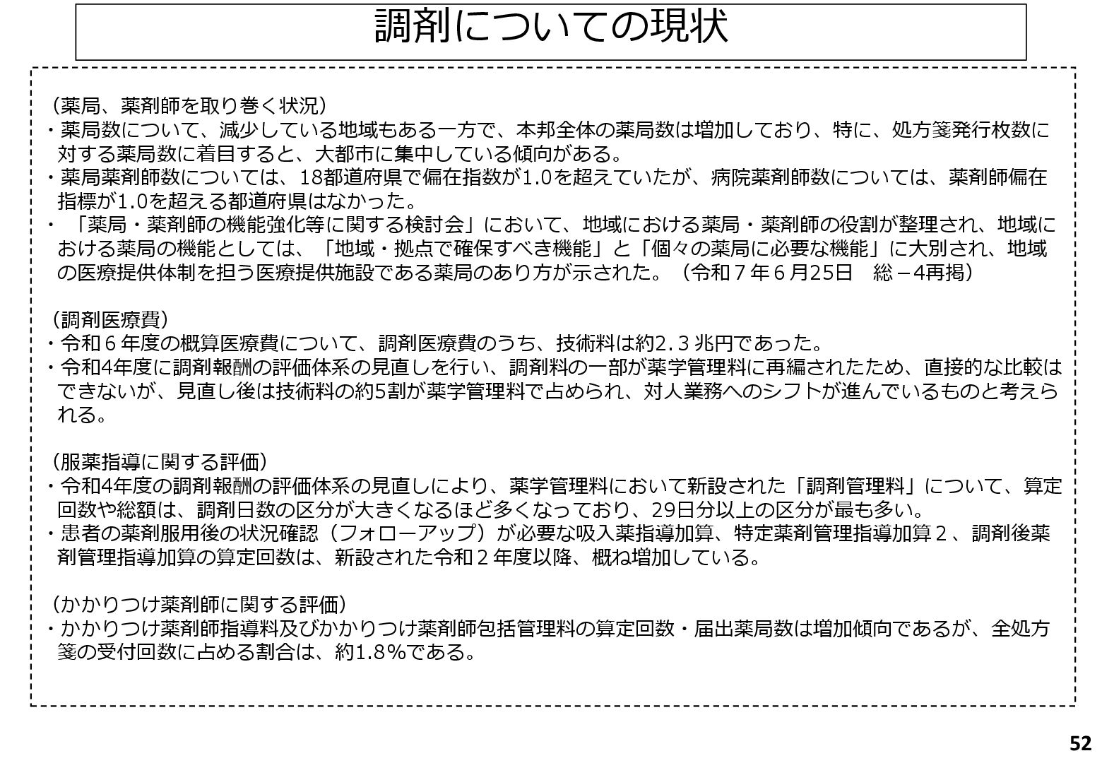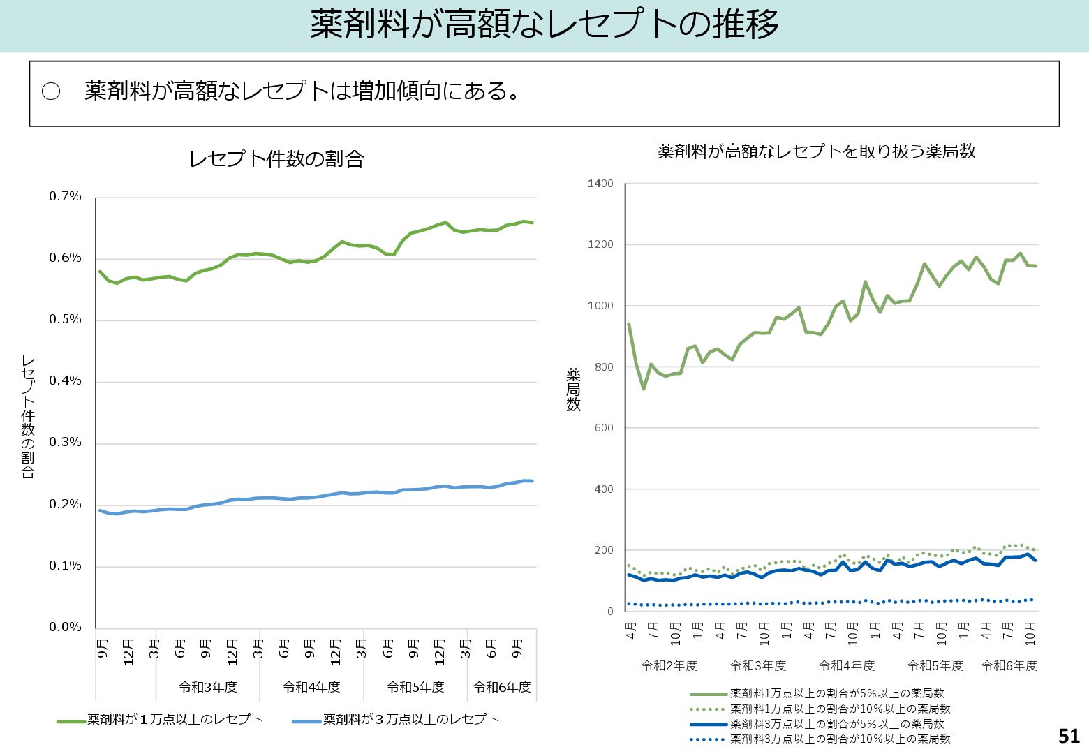9.4% 9.0% 2.9% 2.8% 2.8% 2.8% 2.8% 2.9% 2.8% 3.0% 2.9% 2.9% 2.9% 3.1% 2,309 2,194 2,137 2,079 2,115 2,174 2,136 2,035 2,017 1,933 1,879 1,839 0 500 1,000 1,500 2,000 2,500 3,000 3,500 0.0% 5.0% 10.0% 15.0% 20.0% 25.0% 30.0% 35.0% R6.8 R6.9 R6.10 R6.11 R6.12 R7.1 R7.2 R7.3 R7.4 R7.5 R7.6 R7.7 限定出荷割合 供給停止割合 限定出荷・供給停止品目数計 11.5% 11.0% 10.7% 10.5% 10.7% 10.8% 10.7% 10.3% 10.3% 9.8% 9.4% 9.0% 9.6% 7.5% 7.8% 8.4% 8.7% 9.0% 9.3% 4.5% 4.2% 4.4% 4.6% 4.9% 3,554 3,066 3,103 3,182 3,244 3,339 3,351 2,360 2,313 2,269 2,230 2,209 0 500 1,000 1,500 2,000 2,500 3,000 3,500 0.0% 5.0% 10.0% 15.0% 20.0% 25.0% 30.0% 35.0% R6.8 R6.9 R6.10 R6.11 R6.12 R7.1 R7.2 R7.3 R7.4 R7.5 R7.6 R7.7 限定出荷割合 供給停止割合 限定出荷・供給停止品目数計 通常出荷 88%, 13,417 品目 限定出荷(自社の事情) 4%, 580 品目 限定出荷(他社品の影響) 4%, 658 品目 限定出荷(その他) 1%, 135 品目 供給停止 3%, 466 品目 通常出荷 86%, 13,787 品目 限定出荷(自社の事情) 4%, 634 品目 限定出荷(他社品の影響) 4%, 662 品目 限定出荷(その他) 1%, 137 品目 供給停止 5%, 776 品目 医 療 用 医 薬 品 の 限 定 出 荷・ 供 給停 止 の状 況 の推 移 (令 和 6年 ~ 7年 度 ) ( 供 給 ( 限 定 出 荷 ・ 供 給停 止 )の 状 況) 薬 価 削 除 予 定 品 目 含 む 薬 価 削 除 予 定 品 目 除 く 医療用医薬品の限定出荷・供給停止の推移 医薬品全体の対応状況(令和7年7月) 医薬品全体の対応状況(令和7年7月) 19.5% 19.8% 14.8% 14.5% 14.2% 14.0% 20.0% 13.8% 21.1% 18.5% 18.5% 19.0% 医療用医薬品の限定出荷・供給停止の推移 14.0% 14.2% 14.2% 13.3% 13.2% 12.7% 12.3% 12.1% 15.1% 14.3% 13.8% 13.6% (割合) (品目数) (割合) (品目数) 49