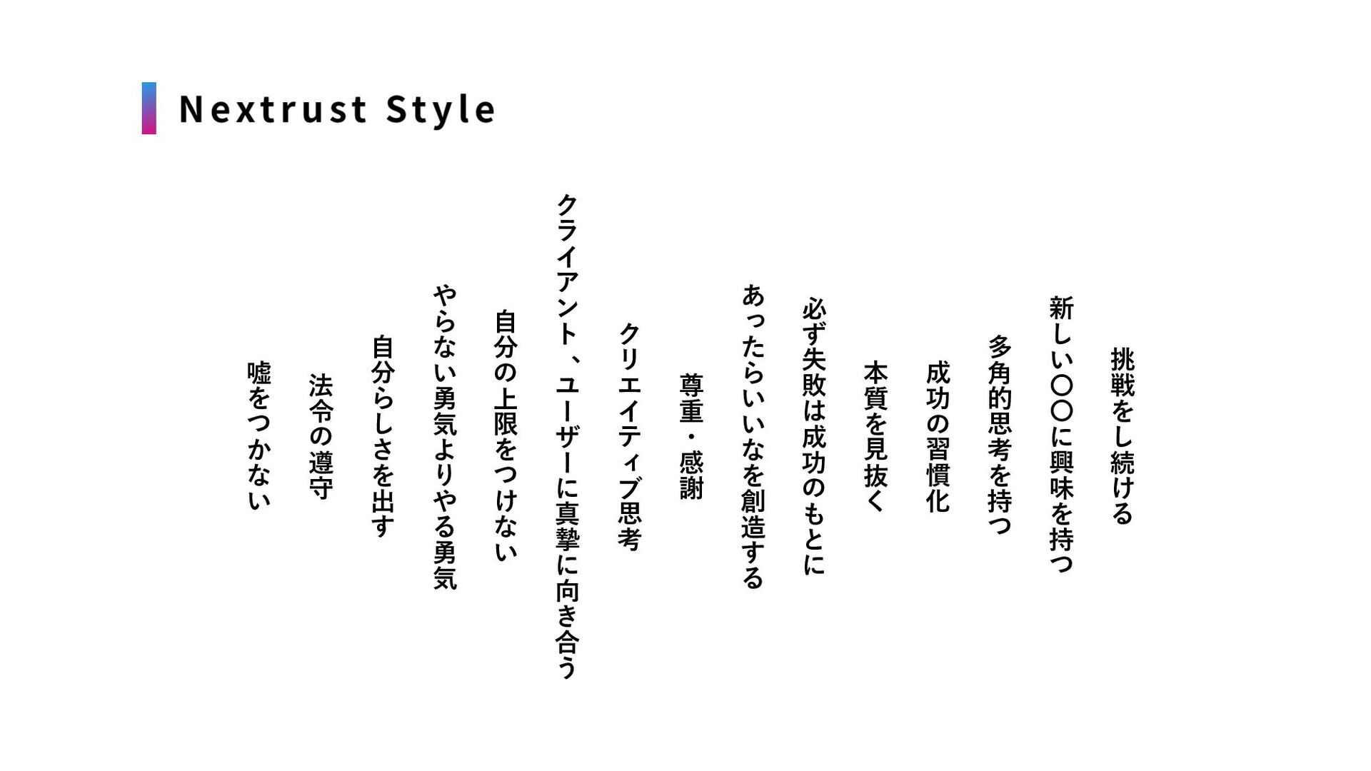 倉⾕ ⼀圭 Ikkei Kuratani 取締役 甲南⼤学卒業後、トーヨータ イヤの営業として⼊社。4ヶ⽉ で会社を退職後、東京に上京。 その後2013年に株式会社リア ルワールドに⼊社。 営業・アドネットワーク事業 リーダーを5年間経験し社⻑賞 を受賞。 2018年に株式会社Nextrustを 設⽴。 2009年⼤学卒業後アパレル メーカーに⼊社。 2013年株式会社speeeに⼊社。 営業・新規事業開発のプロ ジェクトに参加。その後Yoox 株式会社に⼊社。APAC領域の マーケティング・事業開発推 進。 2020年8⽉、Nextrust取締役に 就任。 2006年⼤学卒業後、アフラッ ク⽣命保険株式会社に⼊社。 2011年には、グリー株式会社 にて組織運営を牽引。その後2 つのベンチャーにて、事業開 発、新規事業⽴ち上げ、事業 責任者、マーケティング事業 などに従事する。 2019年11⽉に株式会社リクポ にて取締役COOに就任。また 現在、複数社のスタートアッ プ⽀援にも従事。