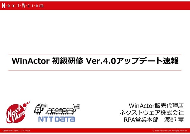 © 2018 Nextware Ltd. All rights reserved. 文書番号:NWT-180611-110TO001 WinActor 初級研修