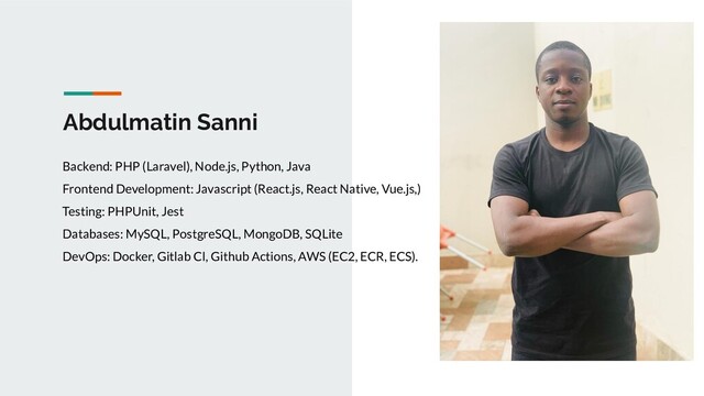 Abdulmatin Sanni Backend: PHP (Laravel), Node.js, Python, Java Frontend Development: