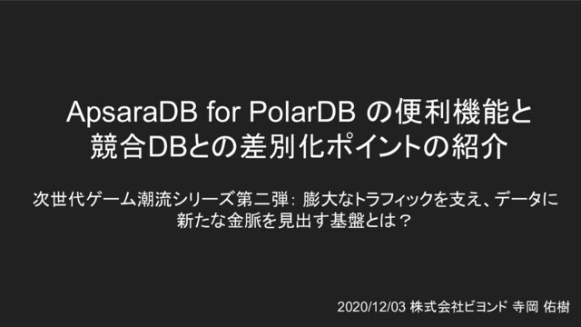 ApsaraDB for PolarDB の便利機能と 競合DBとの差別化ポイントの紹介 次世代ゲーム潮流シリーズ第二弾: 膨大なトラフィックを支え、データに 新たな金脈を見出す基盤とは? 2020/12/03 株式会社ビヨンド