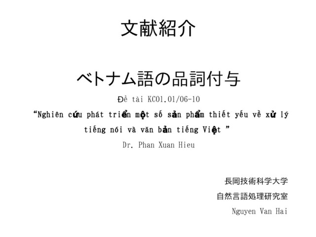 (i = 0;1) is_number(i) (i= -1:0:1) contain_numbers(i) contain_hyphen contain_comma i の単語は数字を含むことや全角をチェックする dict(i) (i= 0,1) 品詞を付与することできる is_full_repretative(0) is_partial_repretative(0) 繰り返しの単語をチェックする prf(0) sff(0) 頭音節 sự 「 sự h ng d n ướ ẫ 」 毛音節 hóa 「 công nghi p ệ hóa 」