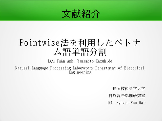 Natural Language Processing Laboratory Department of Electrical Engineering 長岡技術科学大学 自然言語処理研究室 B4 Nguyen Van Hai 文献紹介