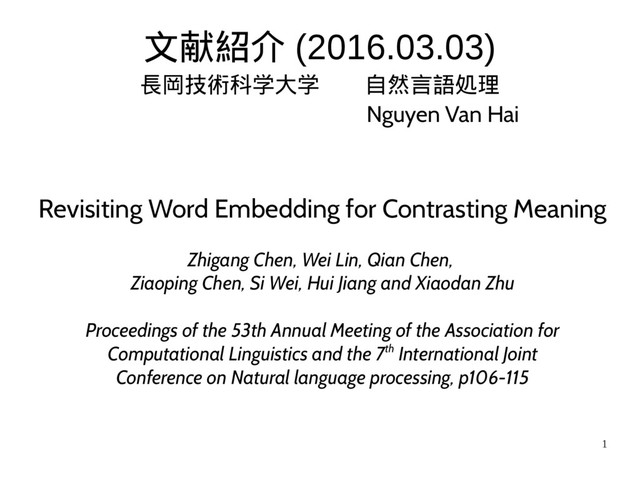 Embedding for Contrasting Meaning Zhigang Chen, Wei Lin, Qian Chen, Ziaoping Chen, Si Wei, Hui Jiang and Xiaodan Zhu Proceedings of the 53th Annual Meeting of the Association for Computational Linguistics and the 7th International Joint Conference on Natural language processing, p106-115