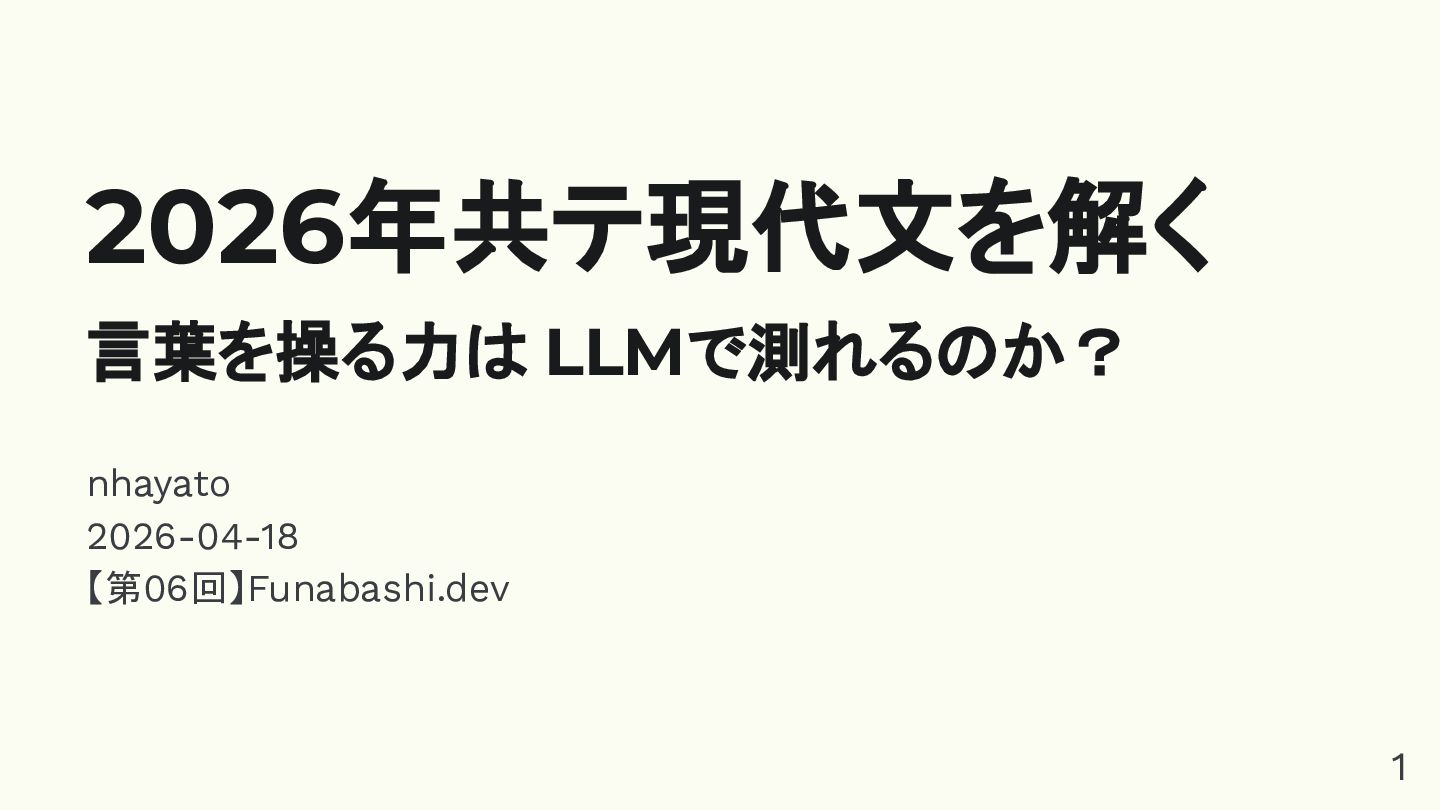 nhayato 2026-04-18 【第06回】Funabashi.dev 2026年共テ現代文を解く 言葉を操る力は LLMで測れるのか? 1