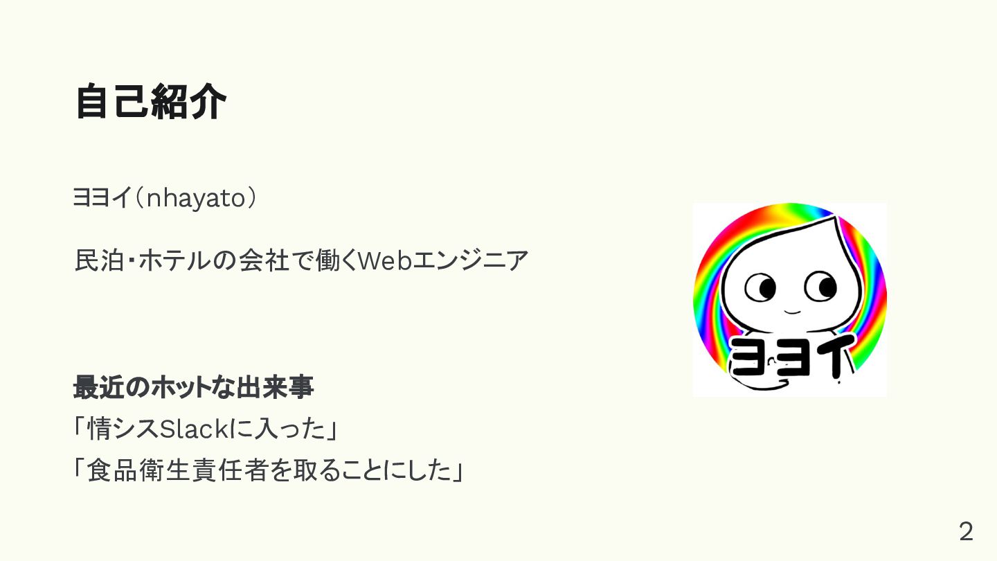 2 ヨヨイ(nhayato) 民泊・ホテルの会社で働くWebエンジニア 最近のホットな出来事 「情シスSlackに入った」 「食品衛生責任者を取ることにした」 自己紹介