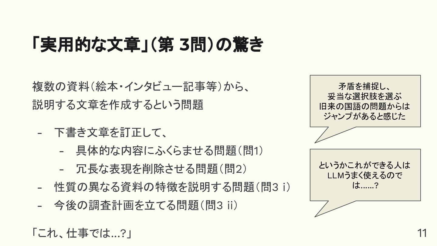 冗長な表現を削除させる問題(問2) - 性質の異なる資料の特徴を説明する問題(問3 i) - 今後の調査計画を立てる問題(問3 ii) 「これ、仕事では...?」 矛盾を捕捉し、 妥当な選択肢を選ぶ 旧来の国語の問題からは ジャンプがあると感じた というかこれができる人は LLMうまく使えるので は......?
