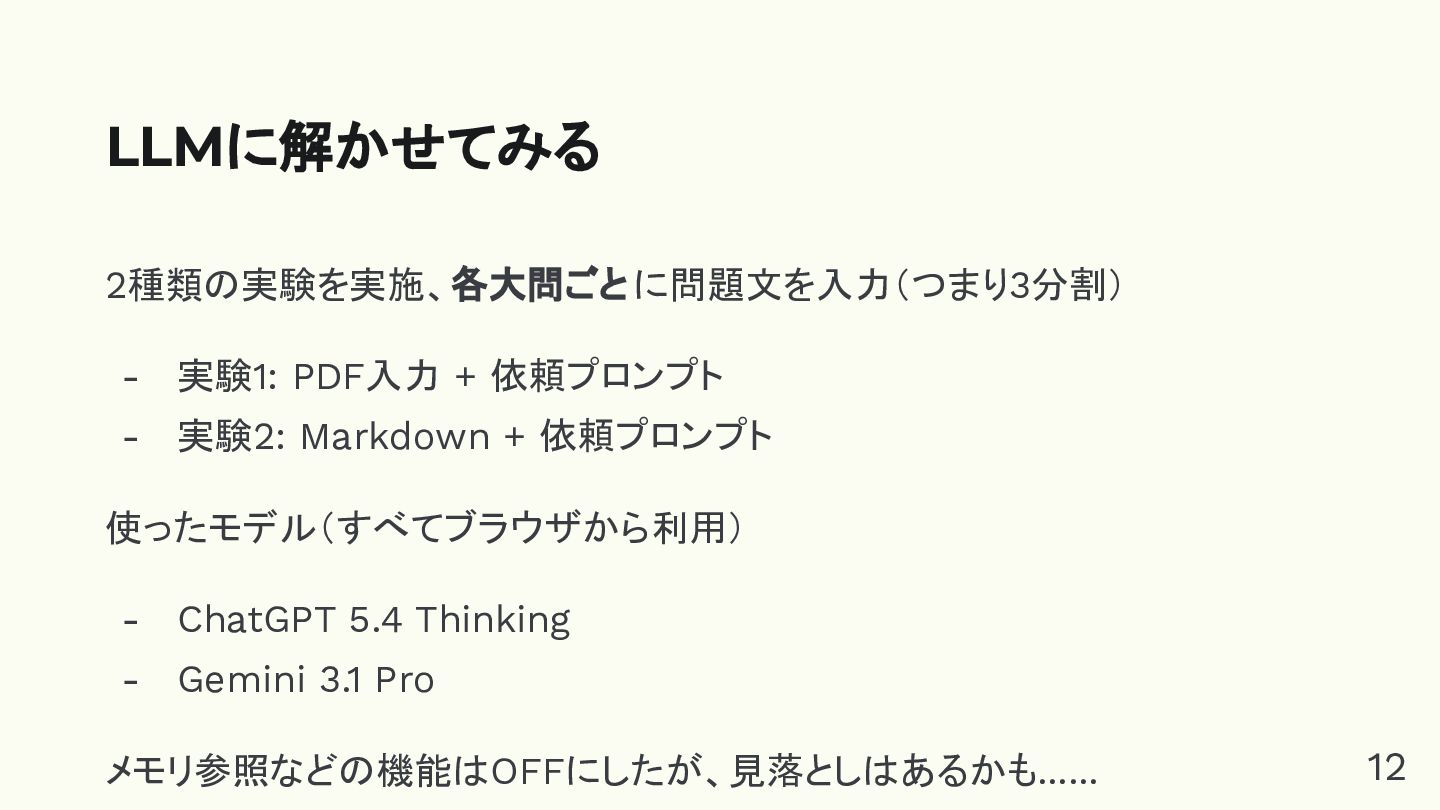 12 2種類の実験を実施、各大問ごと に問題文を入力(つまり3分割) - 実験1: PDF入力 + 依頼プロンプト - 実験2:
