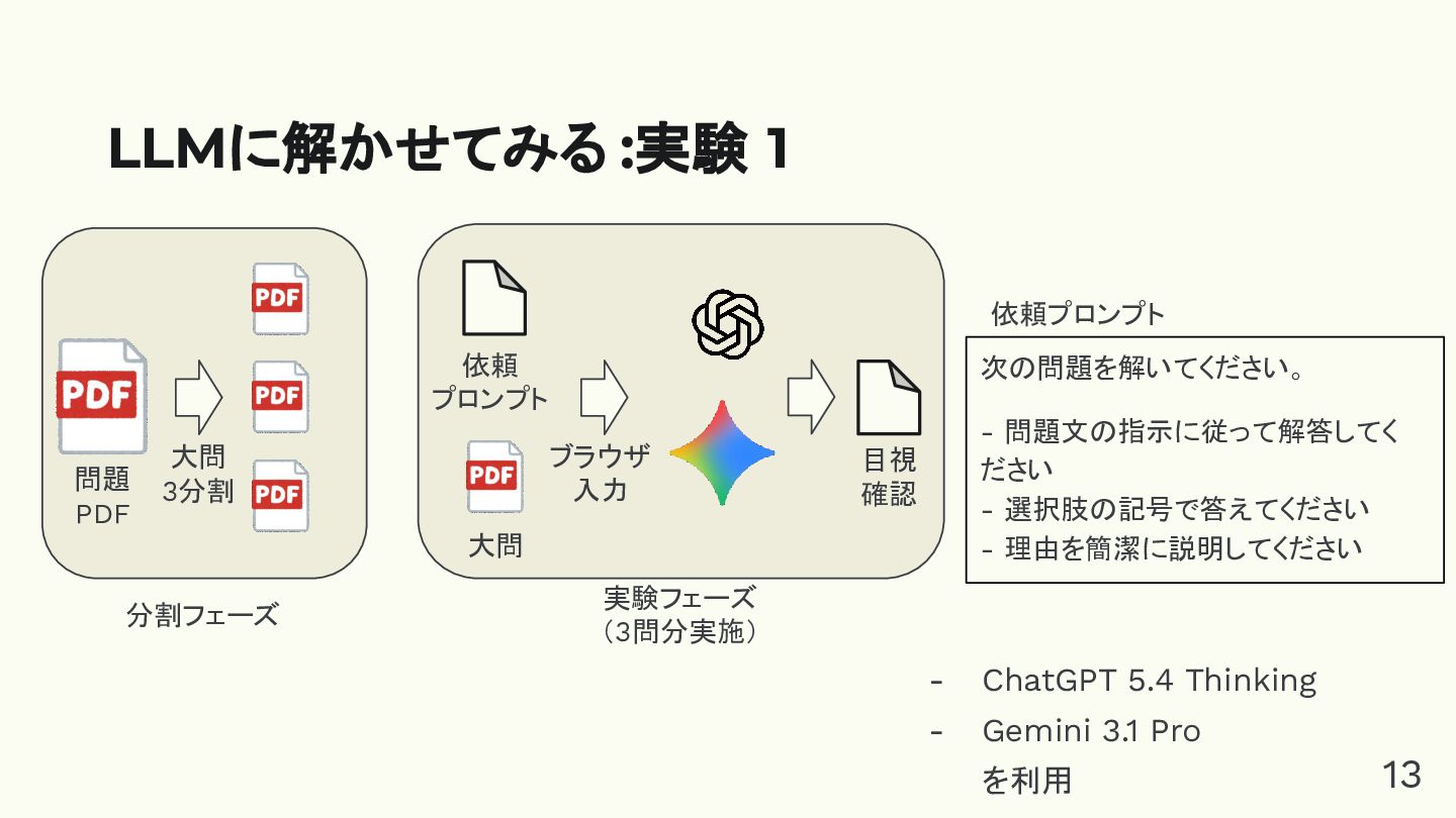13 LLMに解かせてみる :実験 1 依頼 プロンプト 大問 ブラウザ 入力 目視