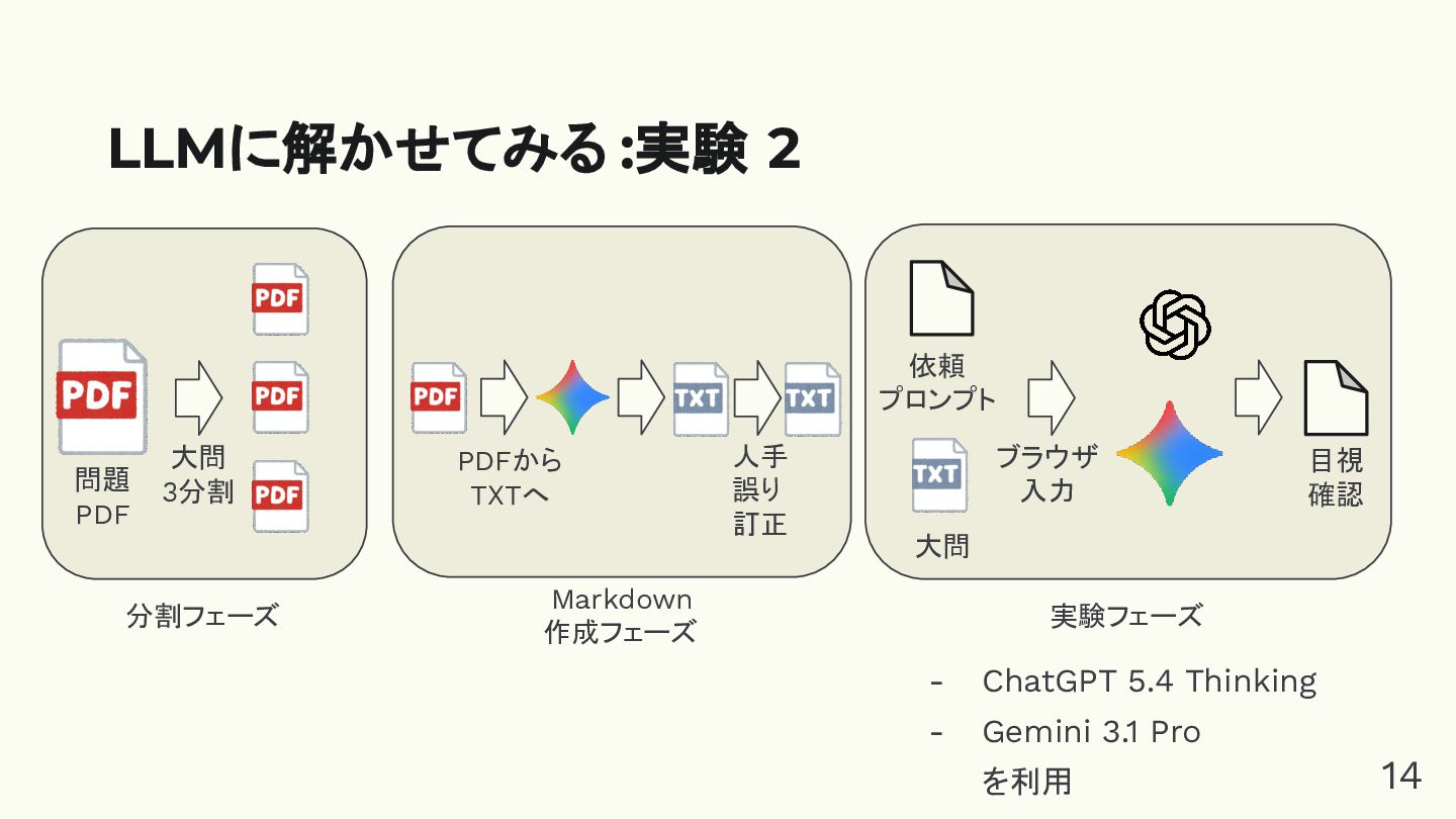 入力 目視 確認 問題 PDF 分割フェーズ 実験フェーズ PDFから TXTへ 人手 誤り 訂正 Markdown 作成フェーズ - ChatGPT 5.4 Thinking - Gemini 3.1 Pro を利用