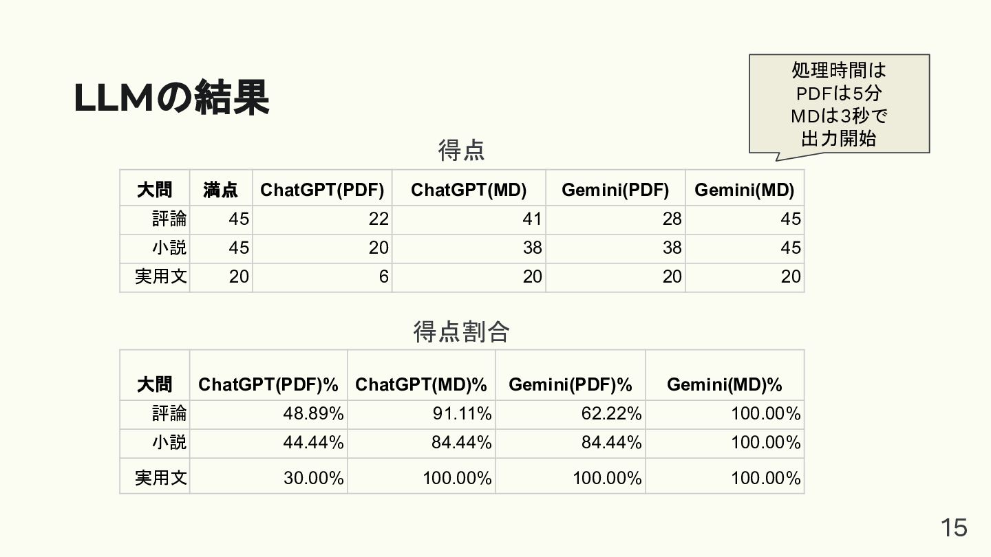 22 41 28 45 小説 45 20 38 38 45 実用文 20 6 20 20 20 大問 ChatGPT(PDF)% ChatGPT(MD)% Gemini(PDF)% Gemini(MD)% 評論 48.89% 91.11% 62.22% 100.00% 小説 44.44% 84.44% 84.44% 100.00% 実用文 30.00% 100.00% 100.00% 100.00% 得点 得点割合 処理時間は PDFは5分 MDは3秒で 出力開始