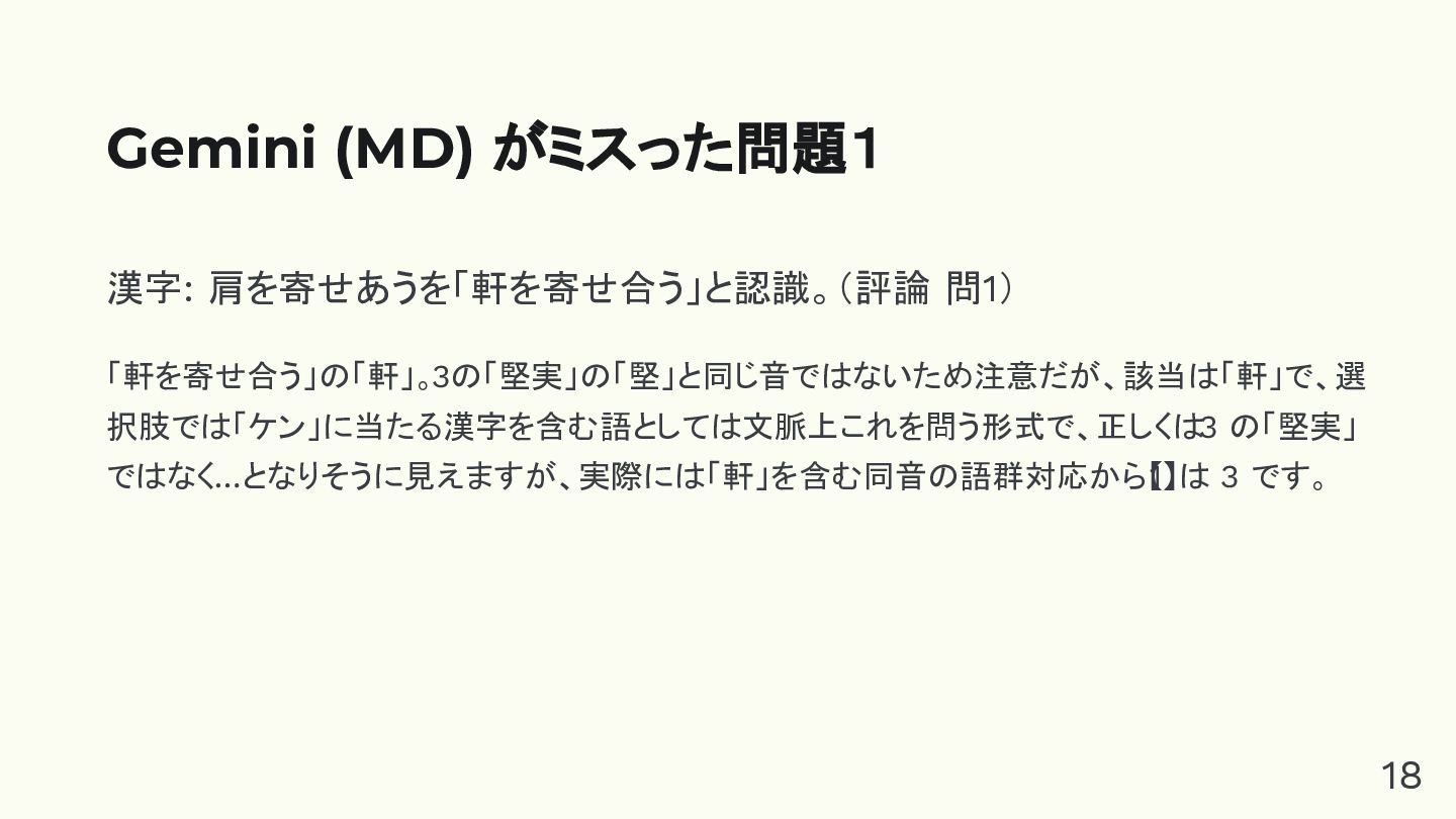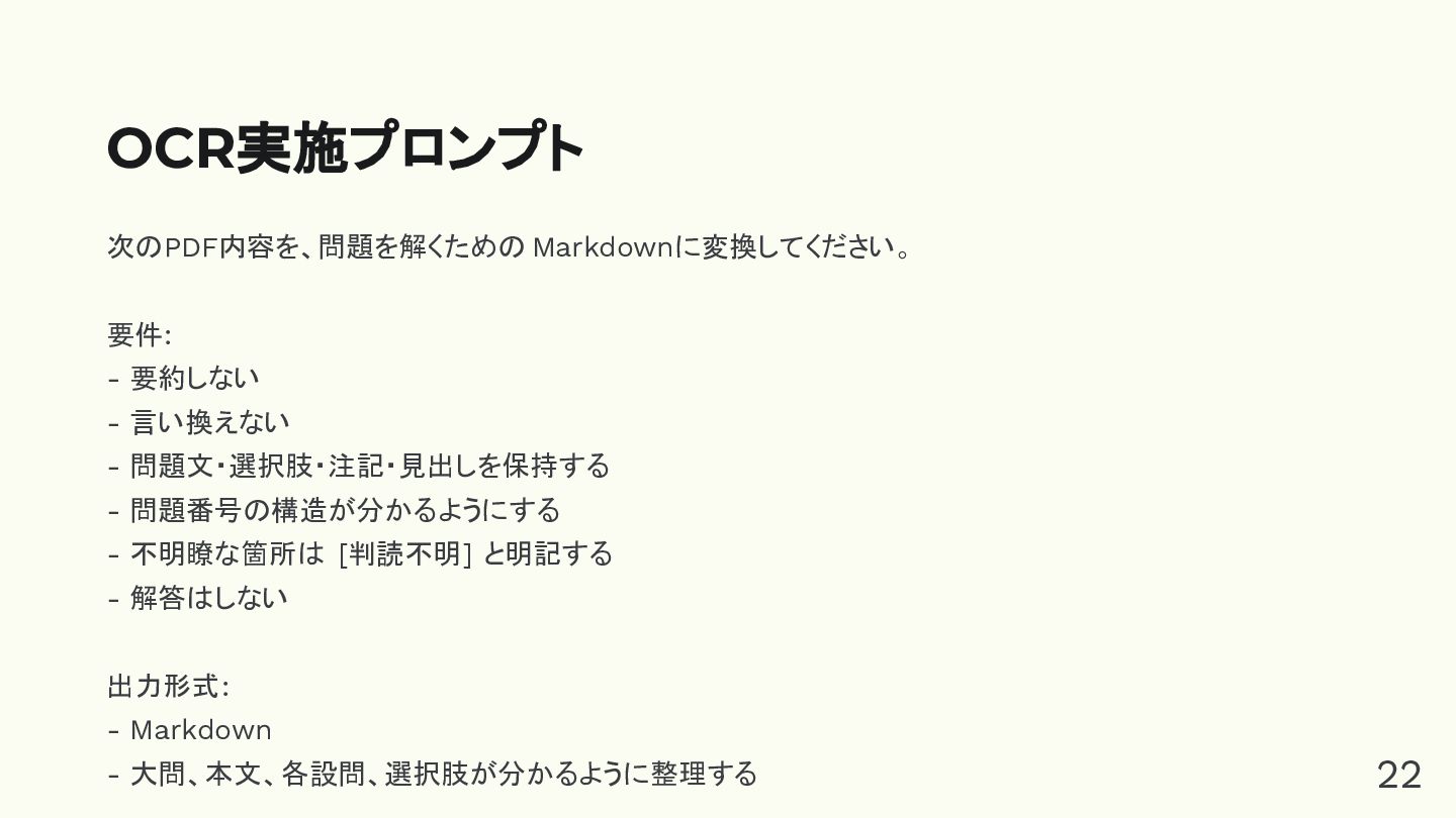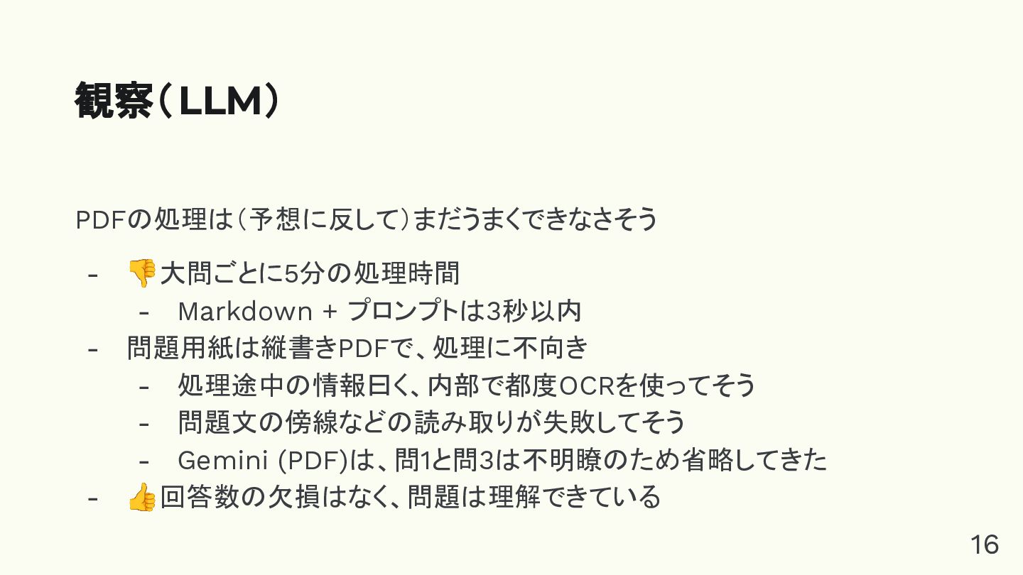 16 PDFの処理は(予想に反して)まだうまくできなさそう - 👎大問ごとに5分の処理時間 - Markdown + プロンプトは3秒以内 - 問題用紙は縦書きPDFで、処理に不向き