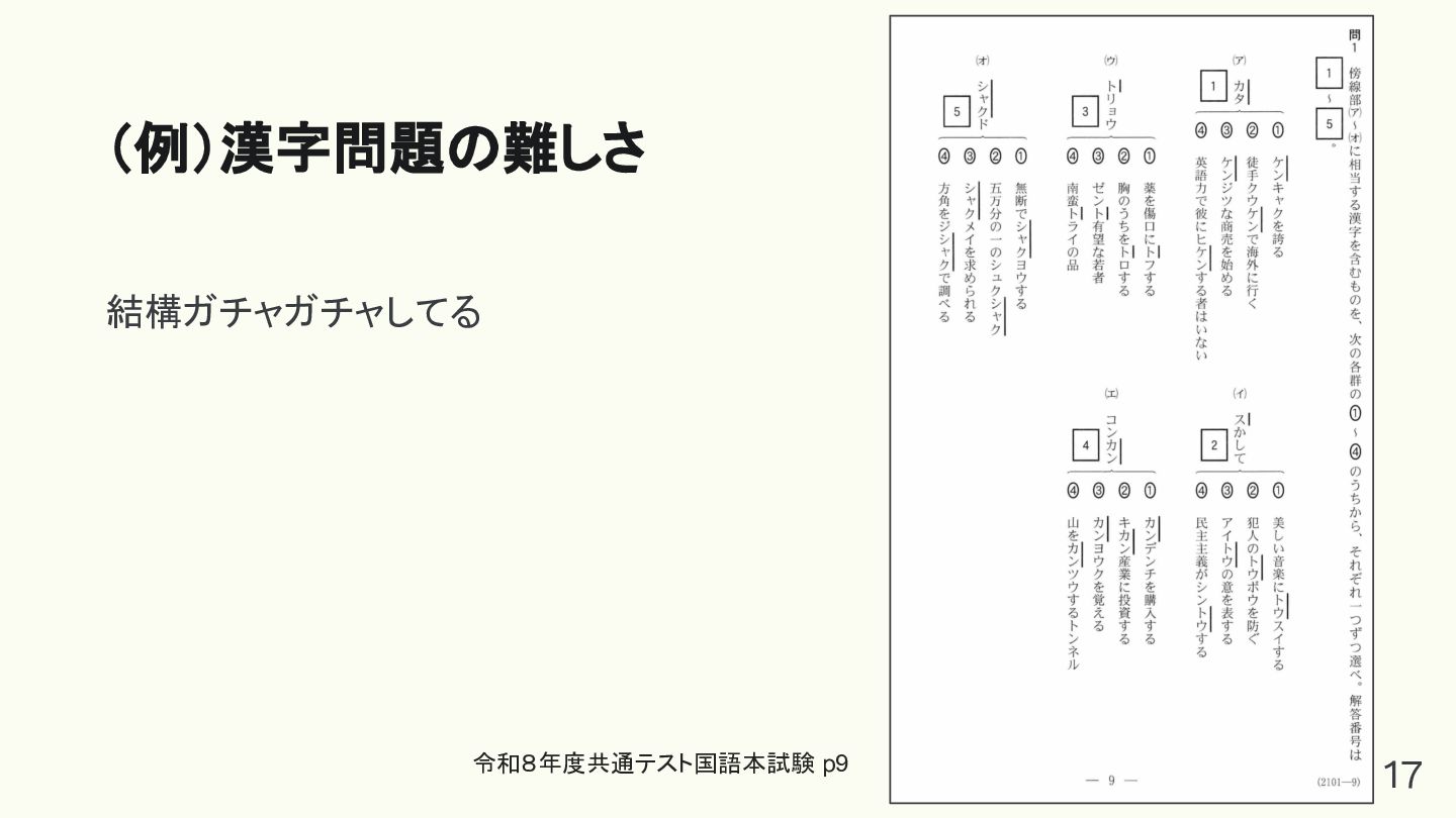 17 (例)漢字問題の難しさ 令和8年度共通テスト国語本試験 p9 結構ガチャガチャしてる