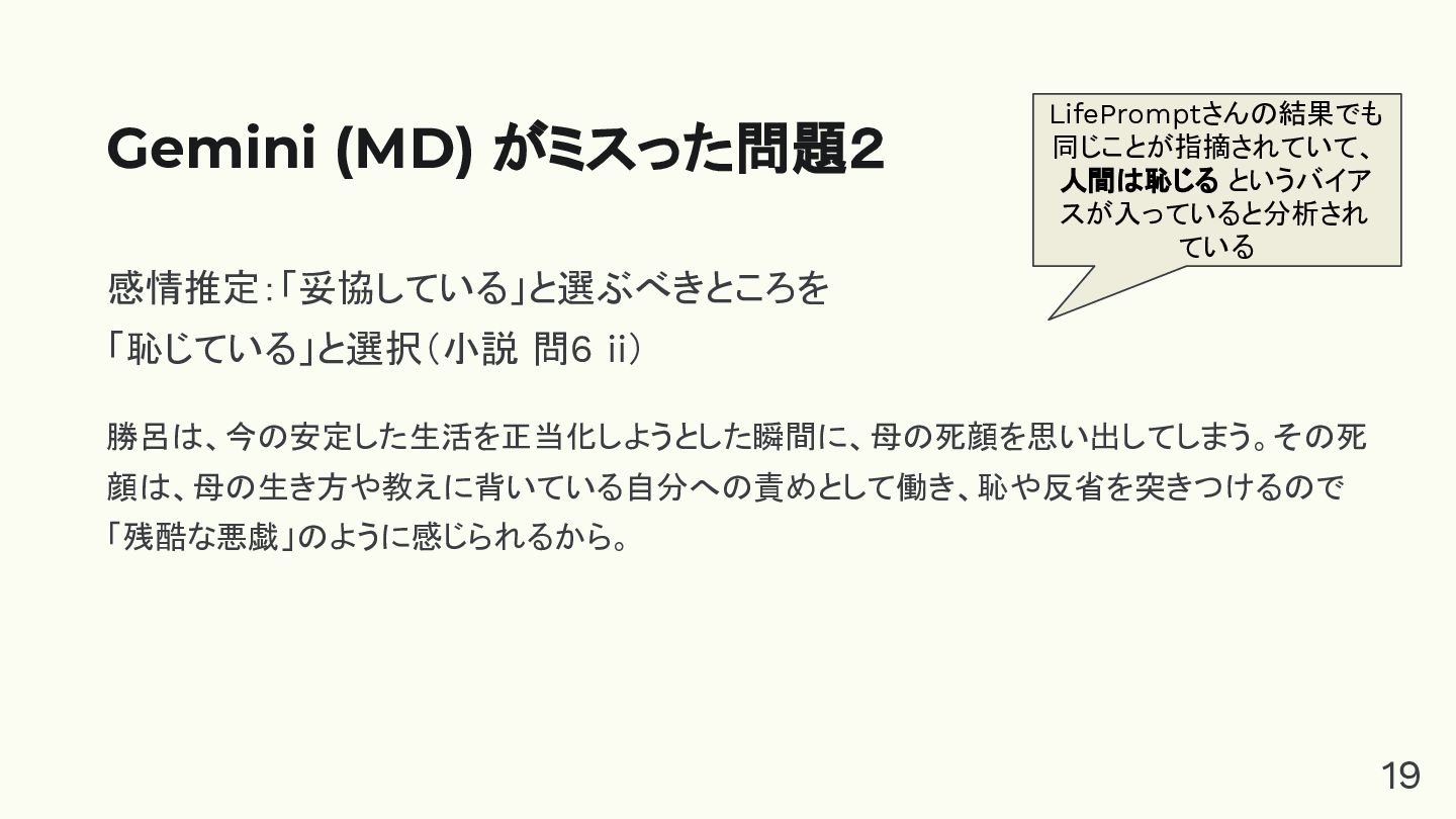 がミスった問題2 LifePromptさんの結果でも 同じことが指摘されていて、 人間は恥じる というバイア スが入っていると分析され ている