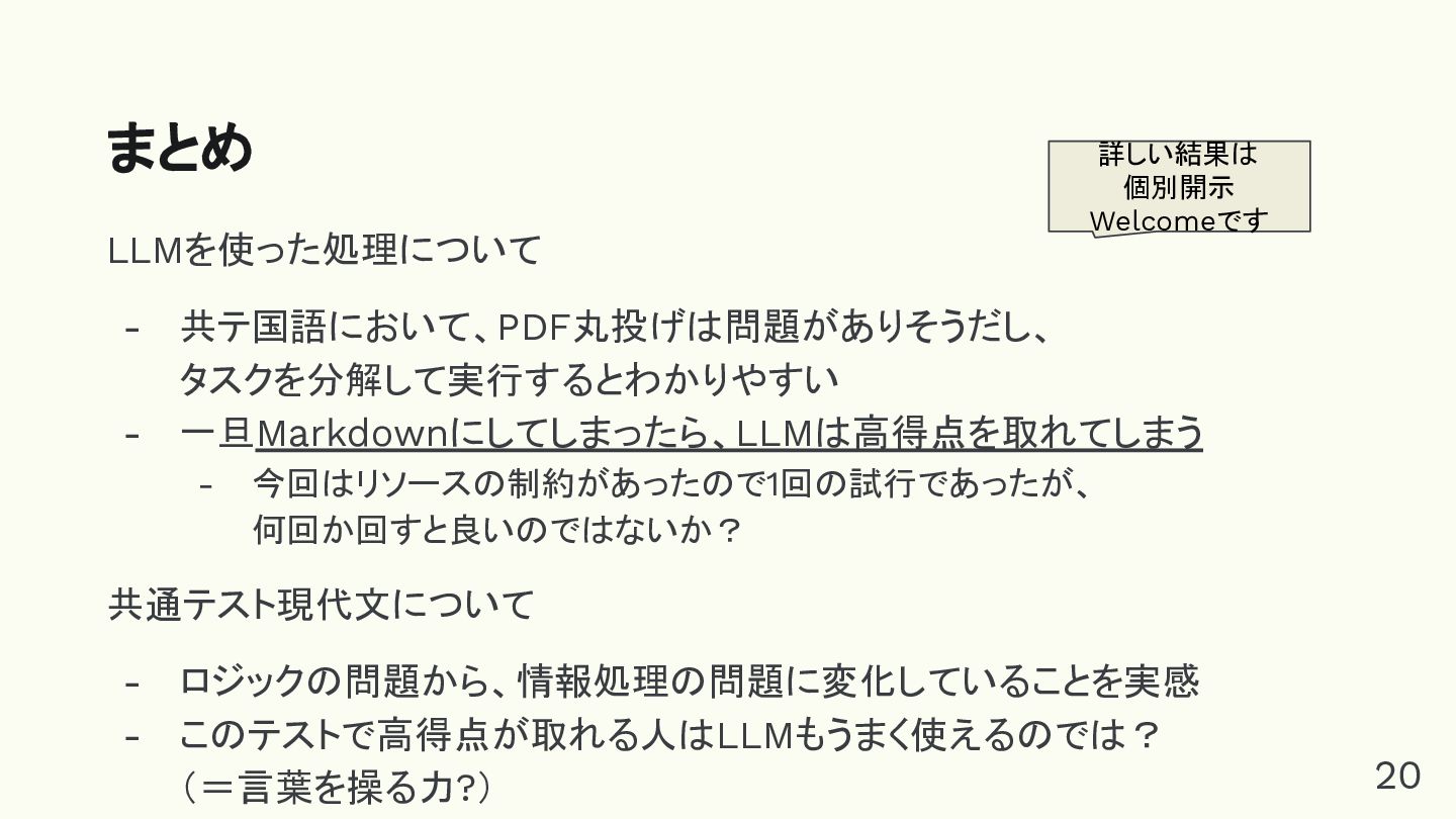 共通テスト現代文について - ロジックの問題から、情報処理の問題に変化していることを実感 - このテストで高得点が取れる人はLLMもうまく使えるのでは? (=言葉を操る力?) まとめ 詳しい結果は 個別開示 Welcomeです