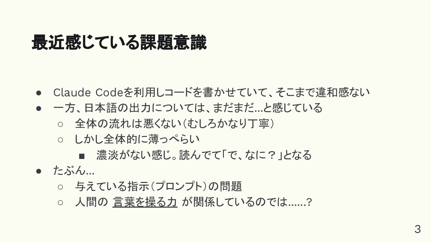 3 • Claude Codeを利用しコードを書かせていて、そこまで違和感ない • 一方、日本語の出力については、まだまだ...と感じている ◦ 全体の流れは悪くない(むしろかなり丁寧) ◦ しかし全体的に薄っぺらい