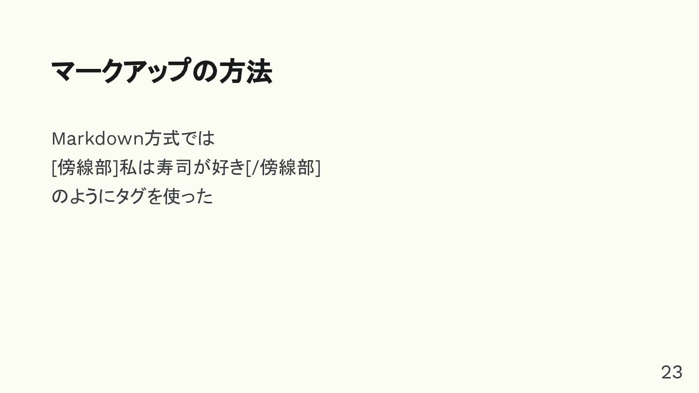 23 Markdown方式では [傍線部]私は寿司が好き[/傍線部] のようにタグを使った マークアップの方法
