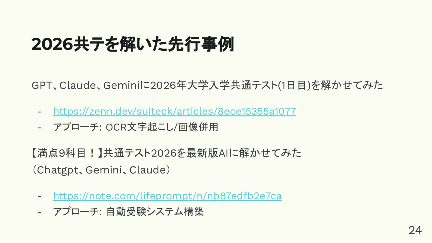 24 GPT、Claude、Geminiに2026年大学入学共通テスト(1日目)を解かせてみた - https://zenn.dev/suiteck/articles/8ece15355a1077 - アプローチ: OCR文字起こし/画像併用 【満点9科目!】共通テスト2026を最新版AIに解かせてみた (Chatgpt、Gemini、Claude) -