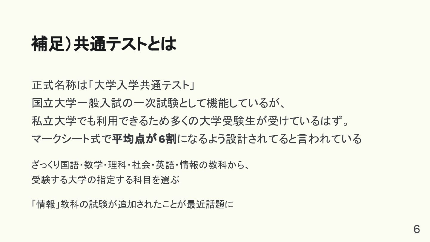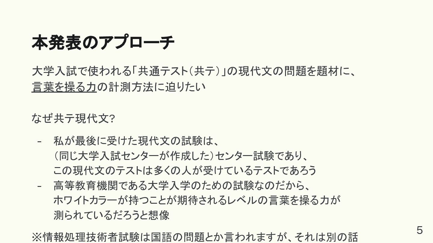 5 大学入試で使われる「共通テスト(共テ)」の現代文の問題を題材に、 言葉を操る力の計測方法に迫りたい なぜ共テ現代文? - 私が最後に受けた現代文の試験は、 (同じ大学入試センターが作成した)センター試験であり、 この現代文のテストは多くの人が受けているテストであろう - 高等教育機関である大学入学のための試験なのだから、