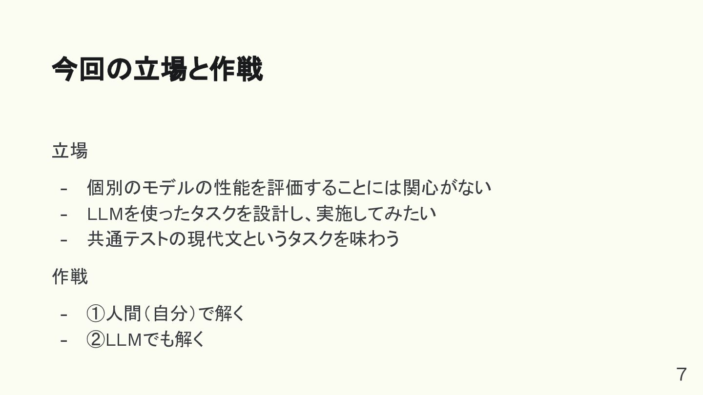 7 立場 - 個別のモデルの性能を評価することには関心がない - LLMを使ったタスクを設計し、実施してみたい - 共通テストの現代文というタスクを味わう 作戦 -