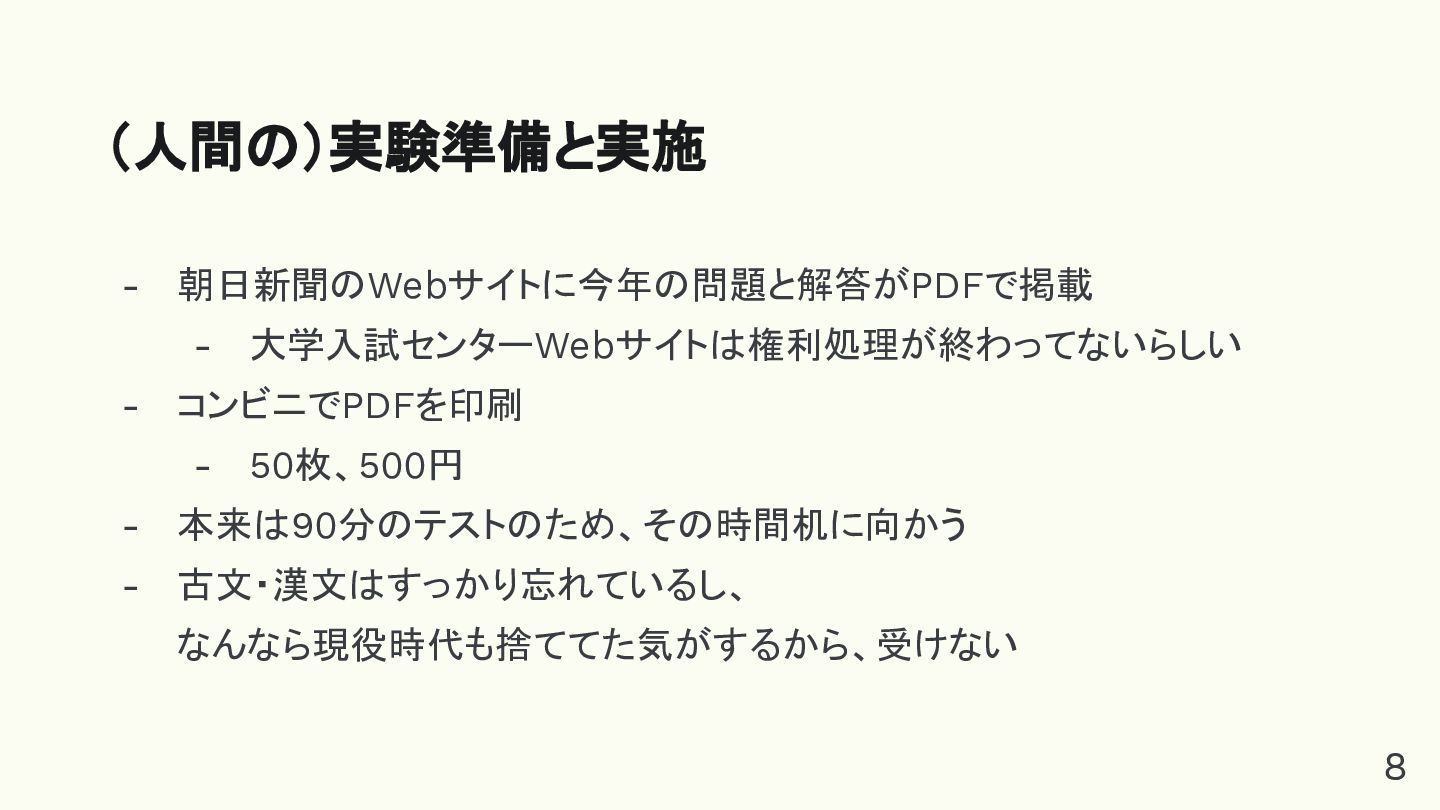 8 - 朝日新聞のWebサイトに今年の問題と解答がPDFで掲載 - 大学入試センターWebサイトは権利処理が終わってないらしい - コンビニでPDFを印刷 - 50枚、500円 -