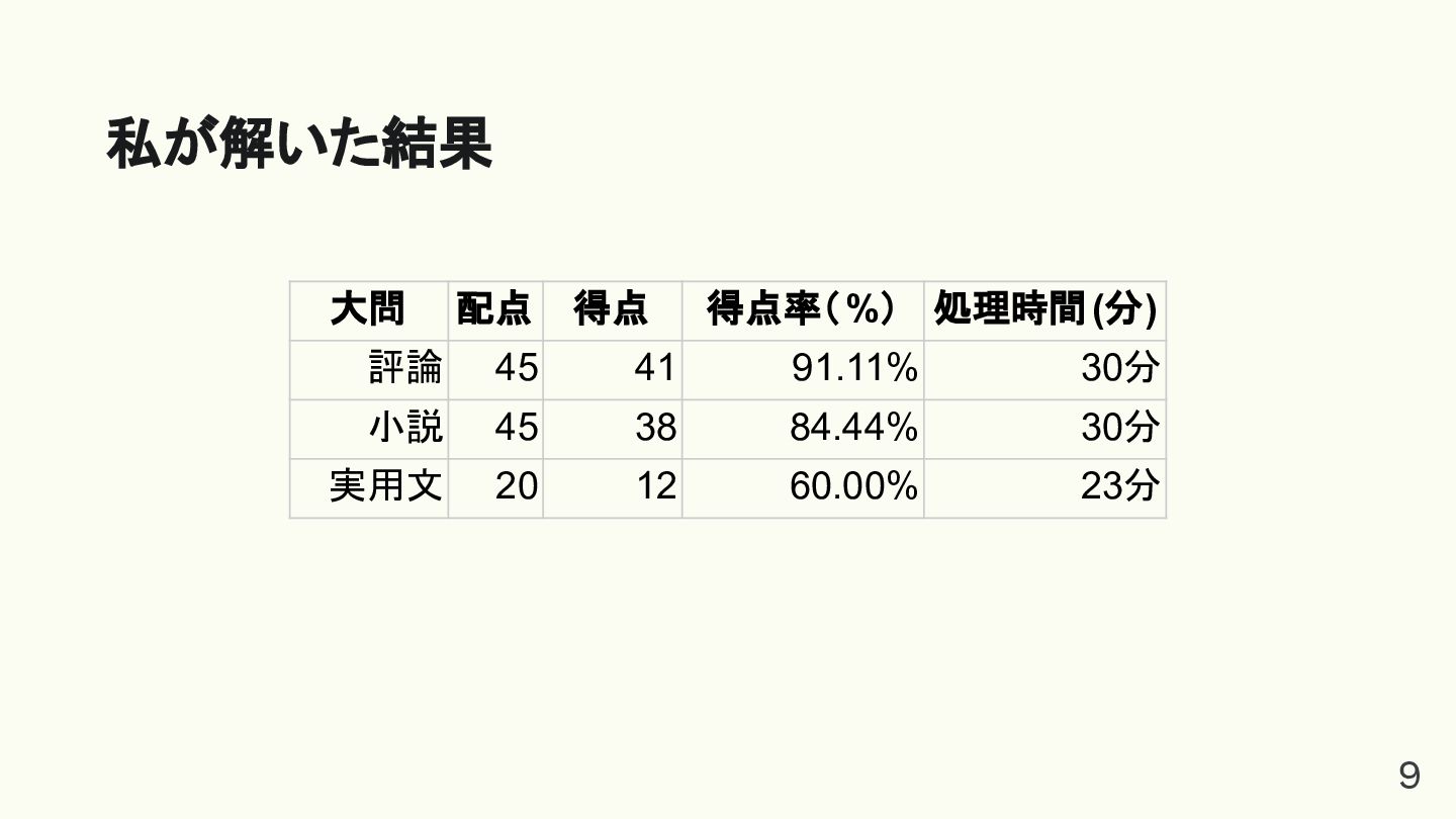 9 私が解いた結果 大問 配点 得点 得点率(%) 処理時間(分) 評論 45 41