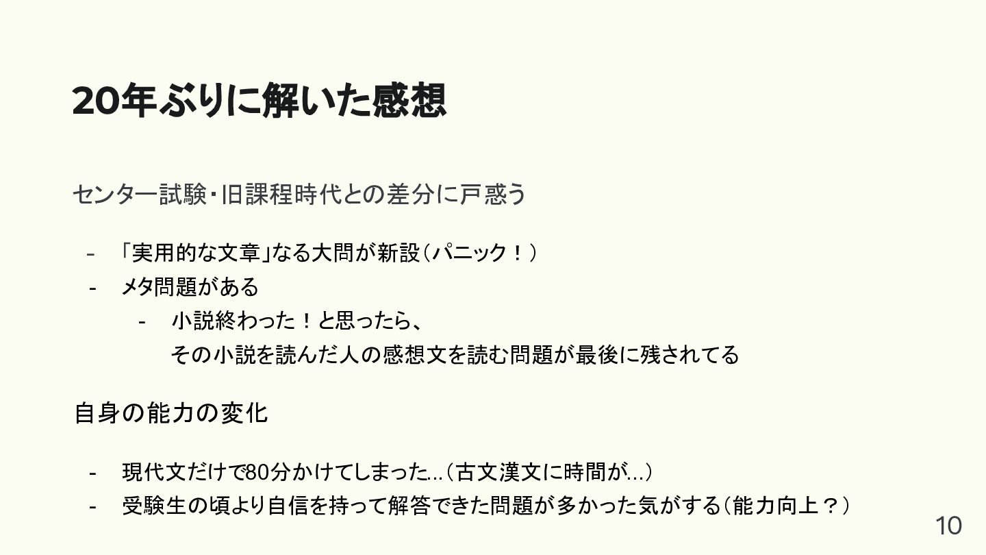 10 センター試験・旧課程時代との差分に戸惑う - 「実用的な文章」なる大問が新設(パニック!) - メタ問題がある - 小説終わった!と思ったら、 その小説を読んだ人の感想文を読む問題が最後に残されてる 自身の能力の変化