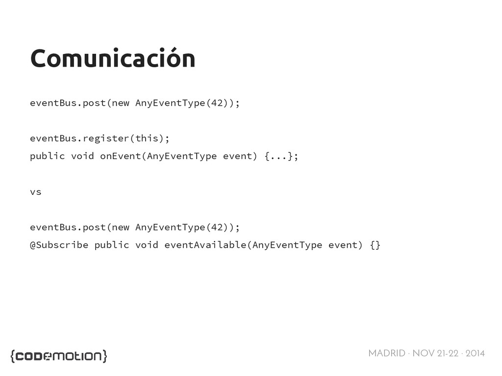MADRID · NOV 21-22 · 2014 Comunicación eventBus.post(new AnyEventType(42)); eventBus.register(this);