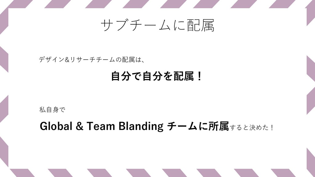 サブチームに配属 Global & Team Blanding チームに所属すると決めた! デザイン&リサーチチームの配属は、 ⾃分で⾃分を配属! 私⾃⾝で