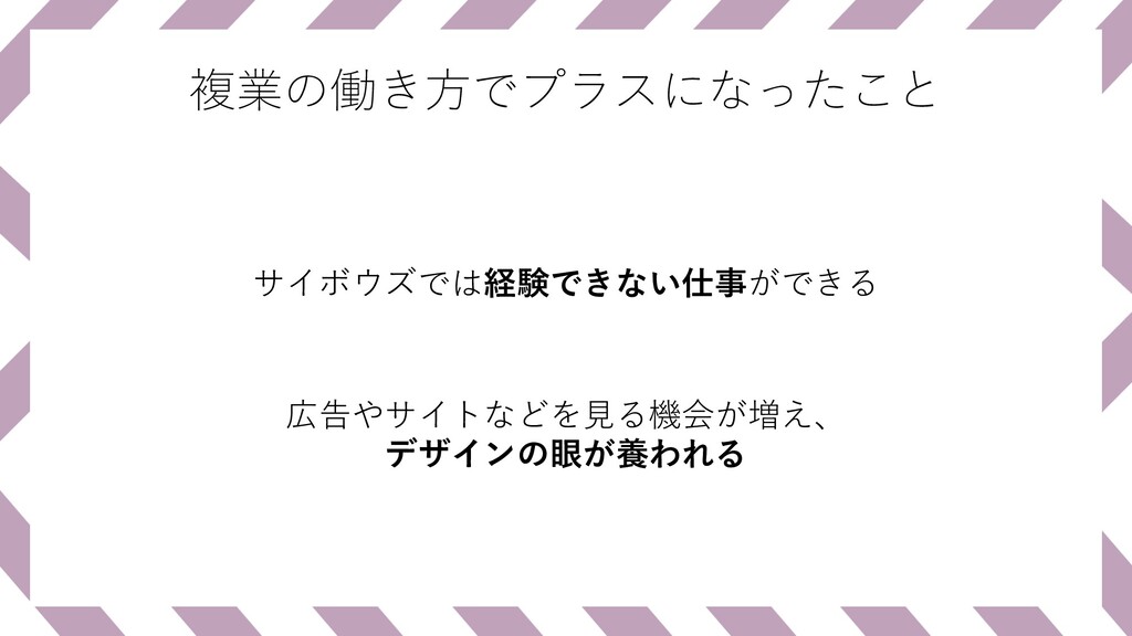 複業の働き⽅でプラスになったこと サイボウズでは経験できない仕事ができる 広告やサイトなどを⾒る機会が増え、 デザインの眼が養われる