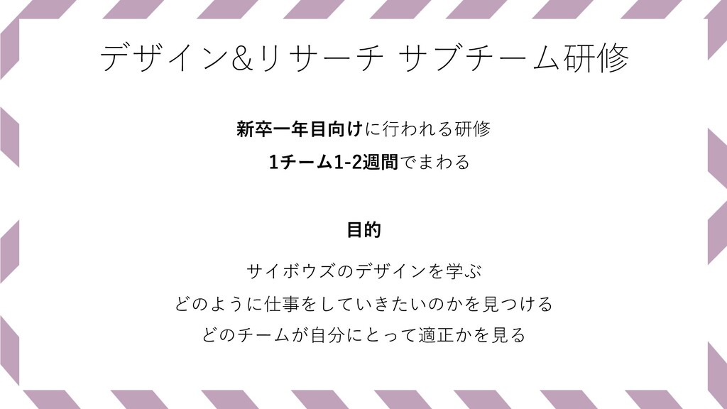 デザイン&リサーチ サブチーム研修 新卒⼀年⽬向けに⾏われる研修 ⽬的 サイボウズのデザインを学ぶ どのように仕事をしていきたいのかを⾒つける どのチームが⾃分にとって適正かを⾒る 1チーム1-2週間でまわる