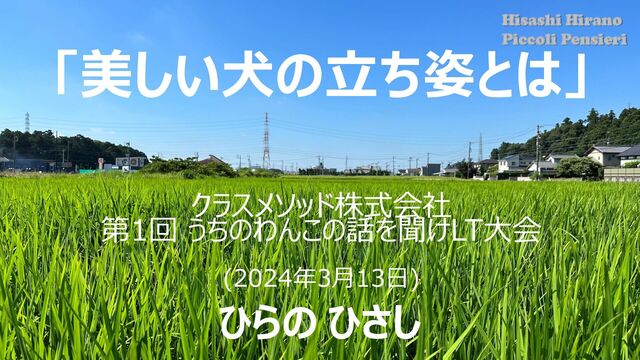 2024年2月13日にクラスメソッド株式会社で開催された「第1回 うちのわんこの話を聞けLT大会」でお話した「美しい犬の立ち姿とは」の資料です。病気で、上手に立てなくなったこなつくんは、病気を克服して上手に立てるようになりました。